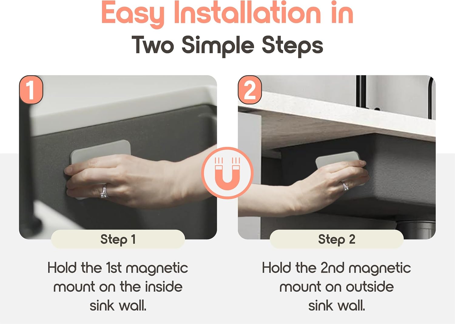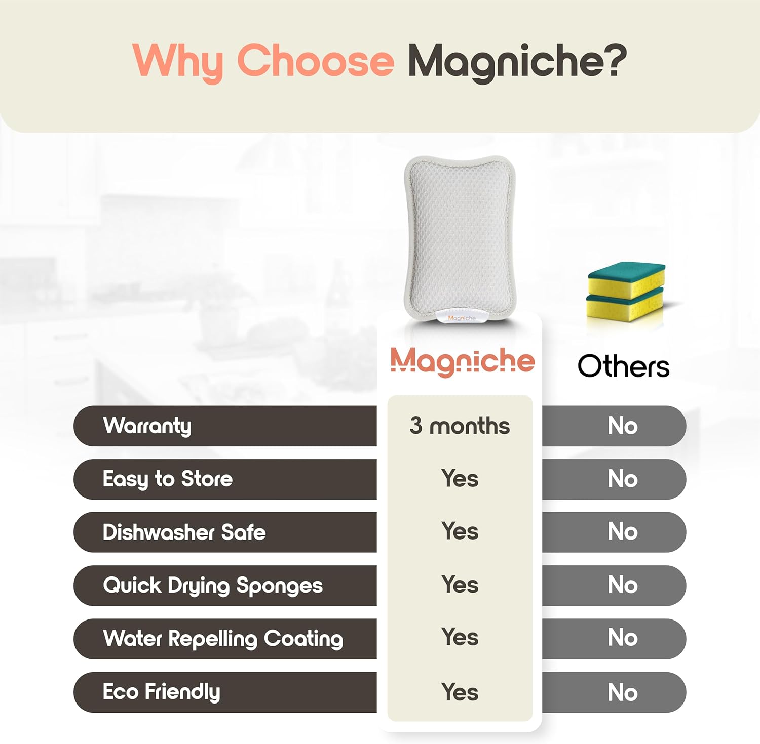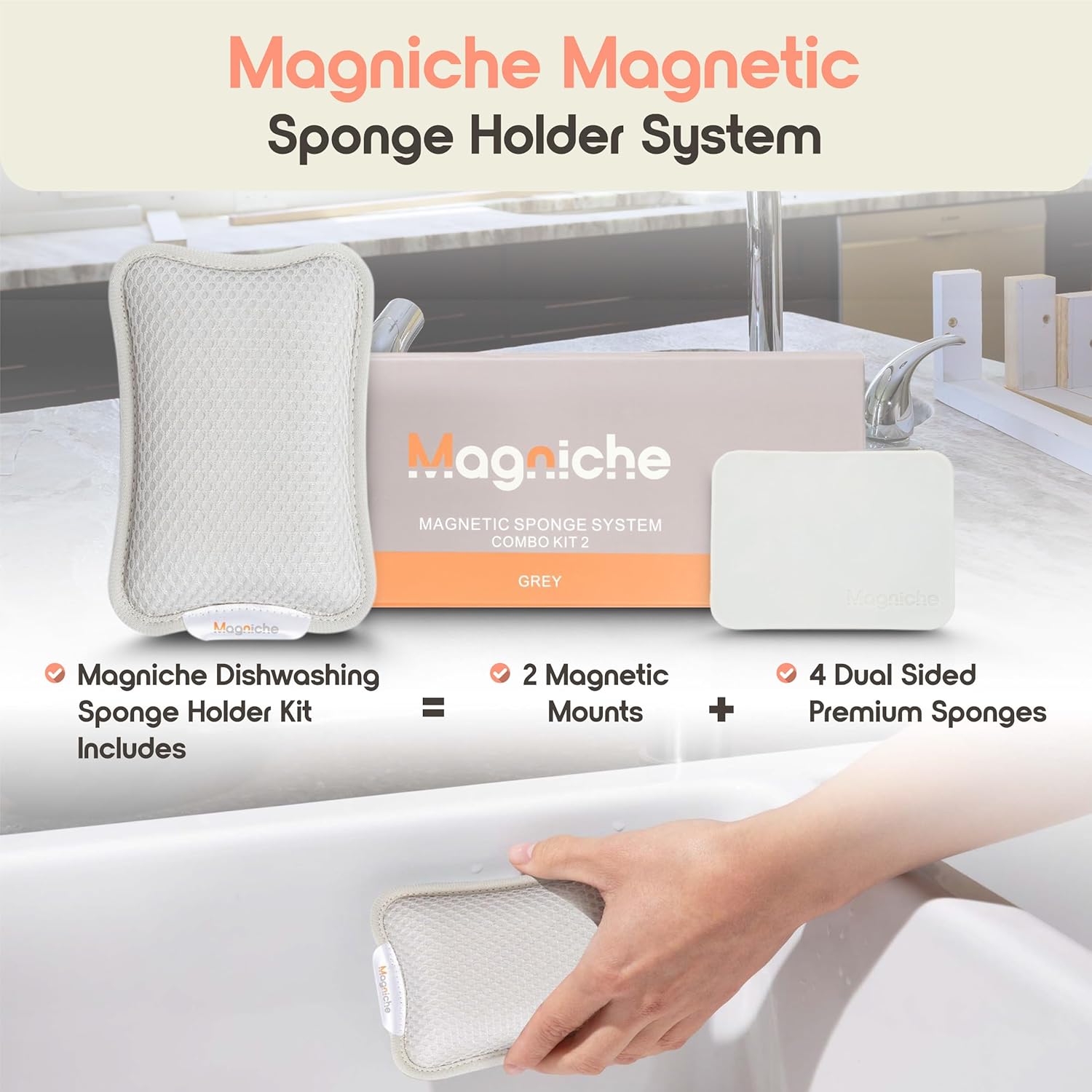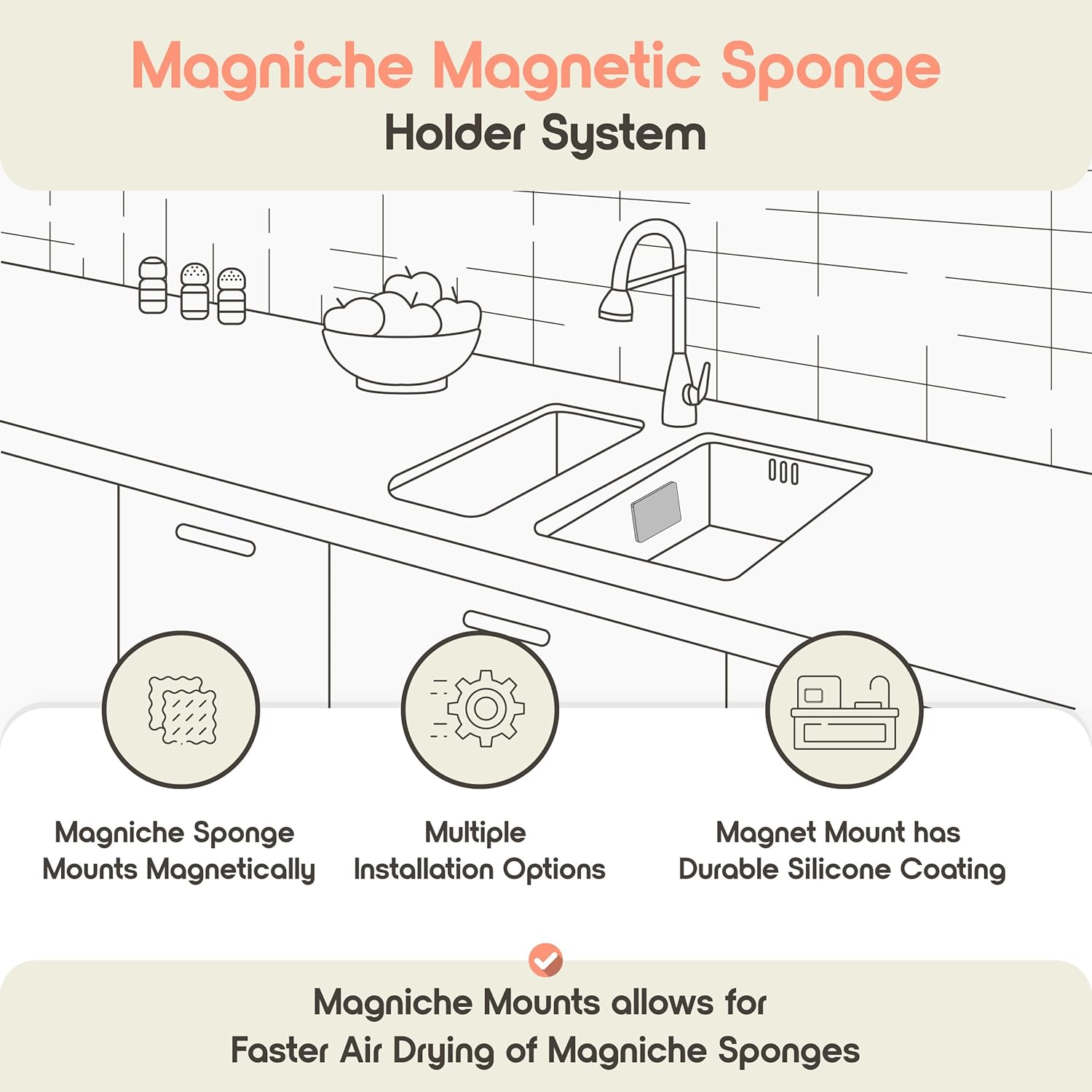 - 𝗜𝗡𝗡𝗢𝗩𝗔𝗧𝗜𝗩𝗘 𝗠𝗢𝗨𝗡𝗧𝗜𝗡𝗚 𝗦𝗬𝗦𝗧𝗘𝗠: The Magniche magnetic sponge system includes two strong holders—one for inside and one for outside the sink. Ideal for kitchen scrubbers and reusable sponges for dishes for users who want a clean, drill-free solution that stays put, even with wet hands.