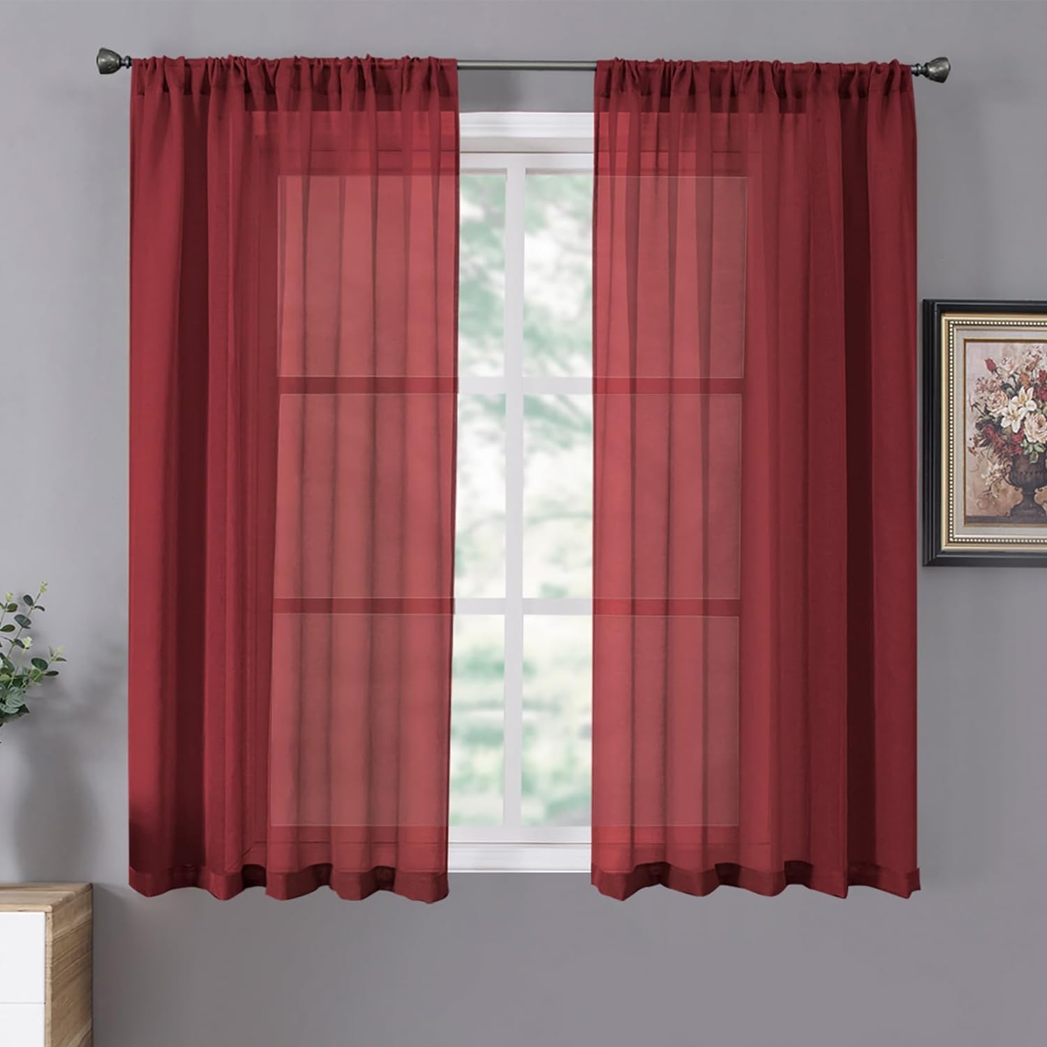Tollpiz Short Sheer Curtain Living Room Linen Textured Curtains Sheer Light Filtering Voile Rod Pocket Curtain for Bedroom, 38 x 54 inches Long, Burgundy Red, Set of 2 Panels