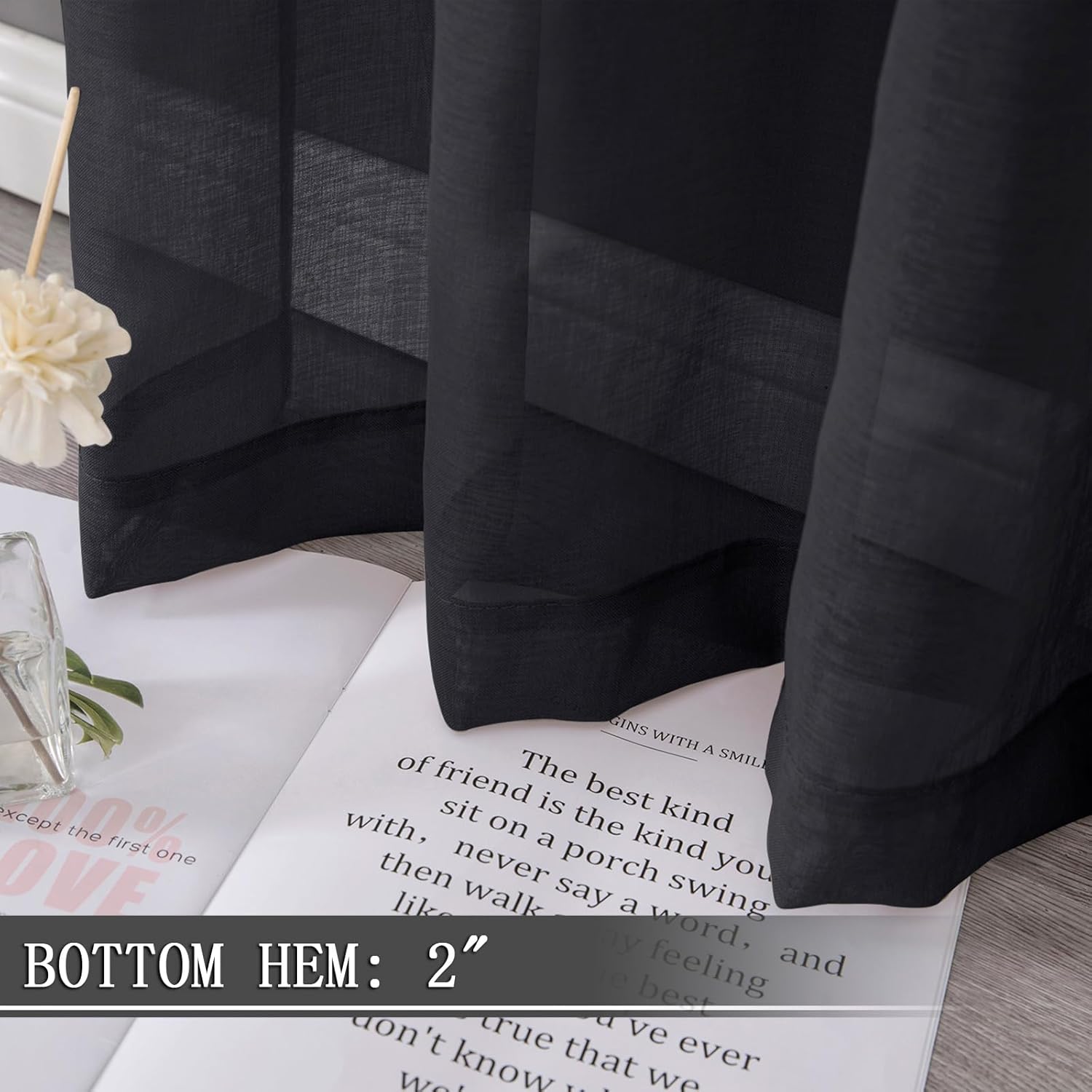 Tollpiz Short Sheer Curtains Living Room Linen Textured Curtain Sheers Light Filtering Voile Rod Pocket Curtains for Bedroom, 38 x 45 inches Long, Black, Set of 2 Panels
