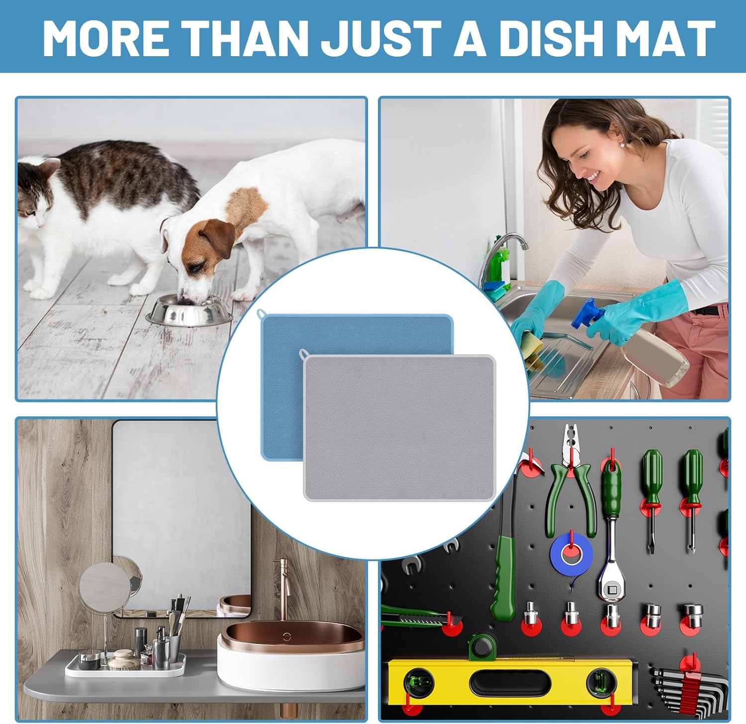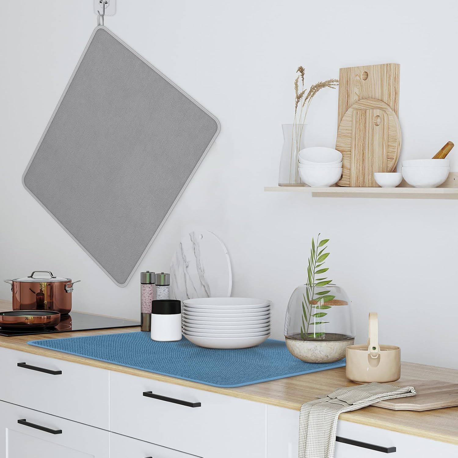 • Reliable Material and Attractive Design: get the ideal balance of functionality and style with our kitchen drying mats for dishes; Made from microfiber, these mats exhibit impressive water absorbent property, ensuring a dry, clean countertop; Their pleasing gray and blue color will effortlessly blend with most kitchen interior, enhancing its aesthetics