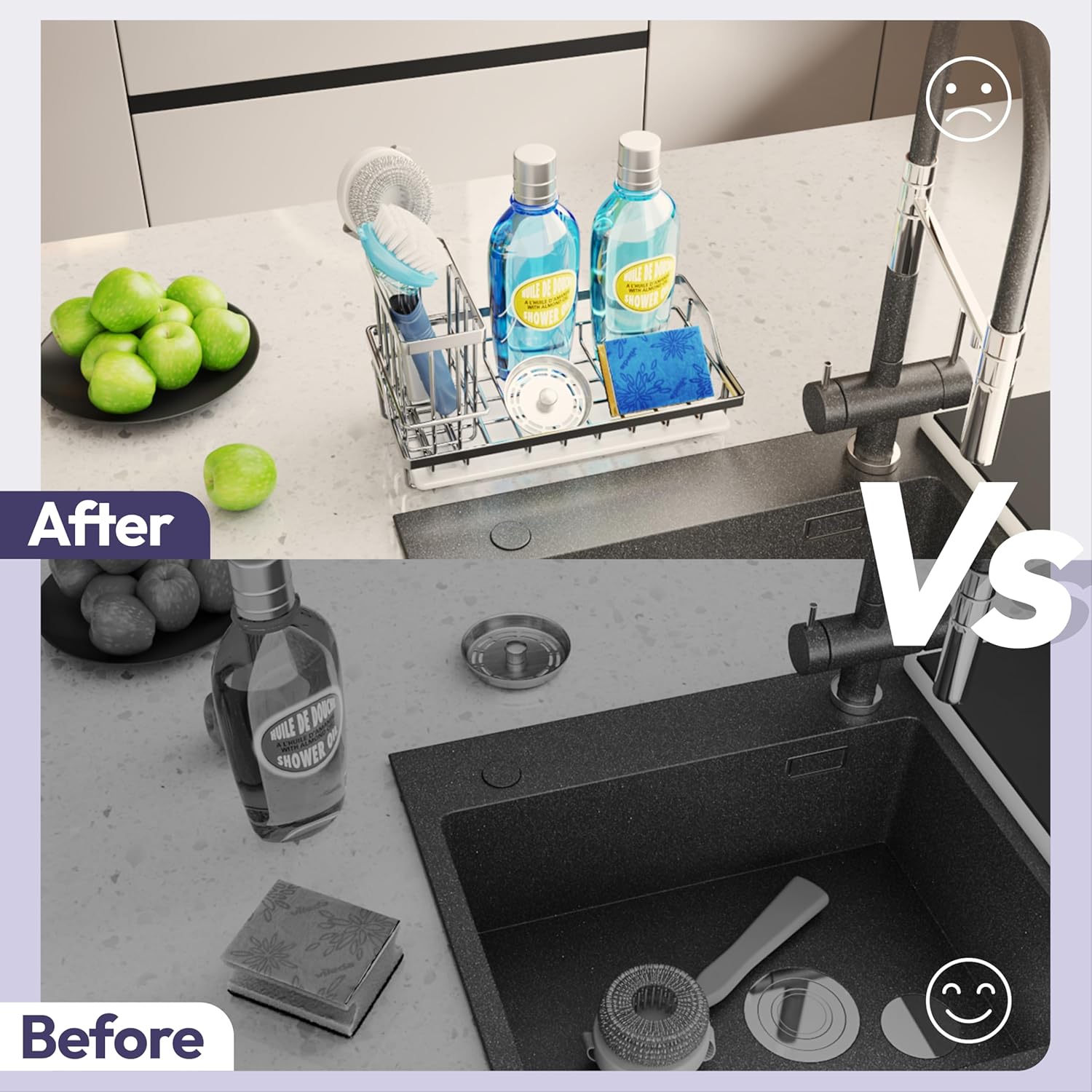 - [Sturdy & Rust-Resistant]: Made from high-quality stainless steel, our soap holder for kitchen sink is durable. Its sturdy construction ensures that kitchen sink organizer countertop can withstand daily use and resist corrosion and rust