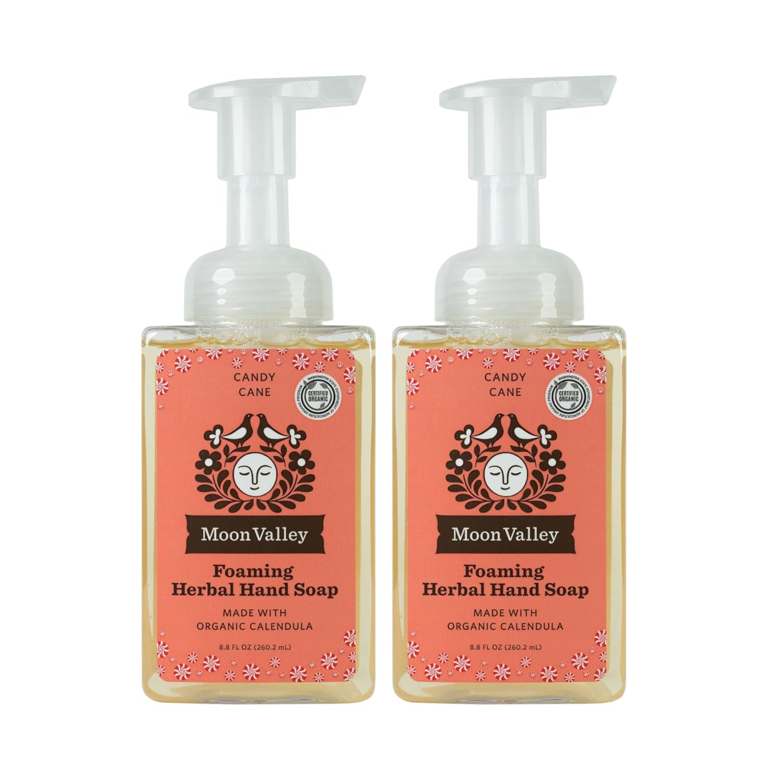 • TWO-PACK: This bundle of two 8.8oz Foaming Hand Soaps includes fresh and natural scents of Candy Canes. Moon Valley Organics Herbal Foaming Hand Soaps are certified organic, vegan and non-gmo. Each bottle is recyclable. Ingredients leave hands soft and moisturized.