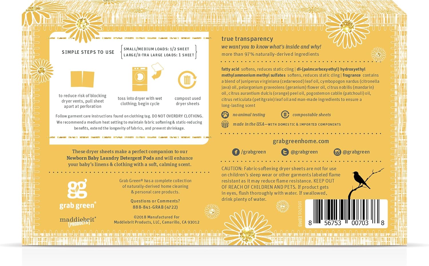 Grab Green Newborn Baby Dryer Sheets, 40 Sheets, Chamomile Scent, Plant and Mineral Based, Compostable, Softens Clothing and Linens, Reduces Static Cling