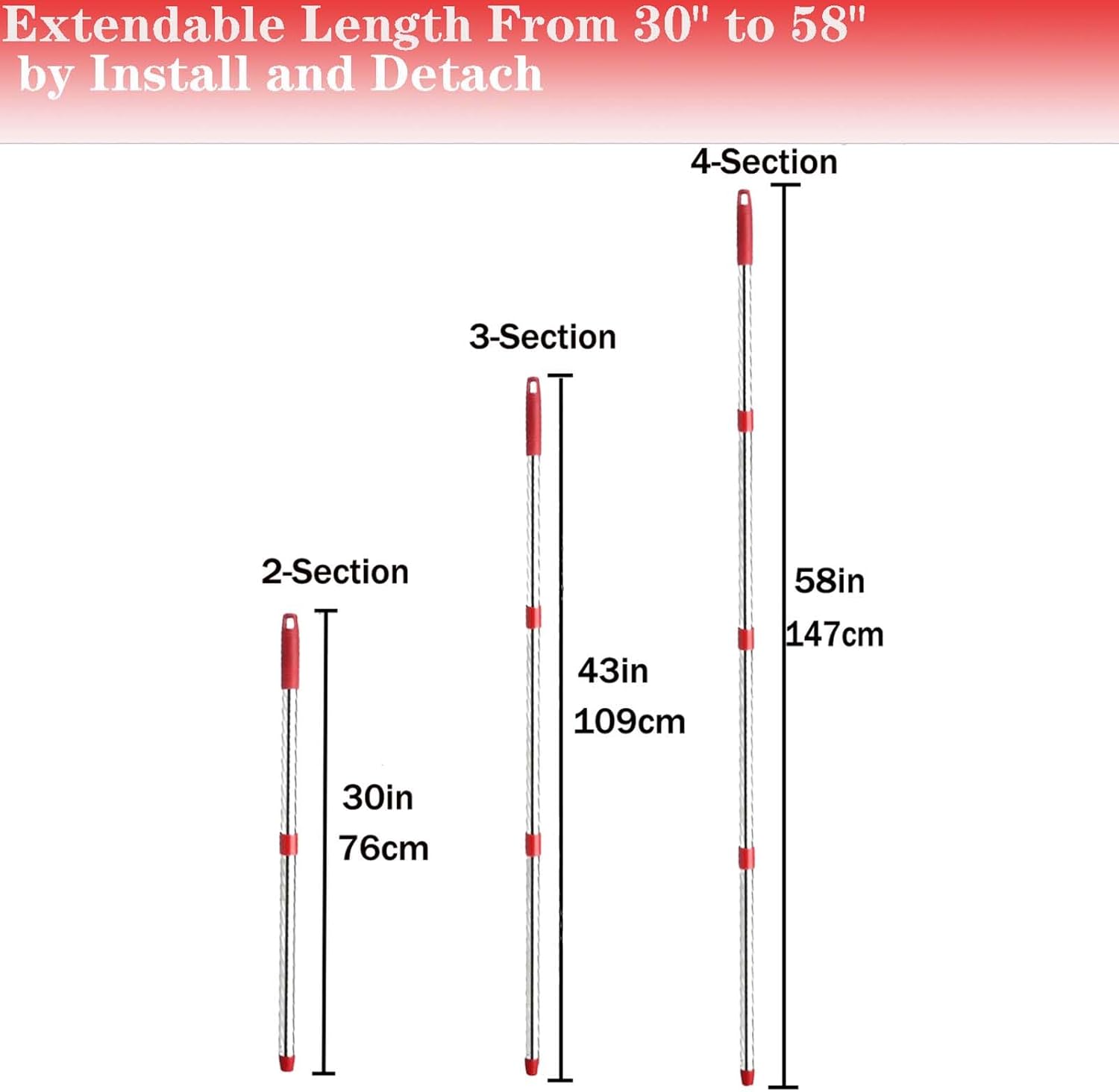 • 【Easy to install】 The mop poles are rotated to install and tighten. Very easy to assemble. It comes in 4 sections and can be adjusted from 30in to 58in. You can combine it into different sizes according to your height, usage habits, and scenarios. You can combine it into different sizes according to your height, usage habits, and scenarios.