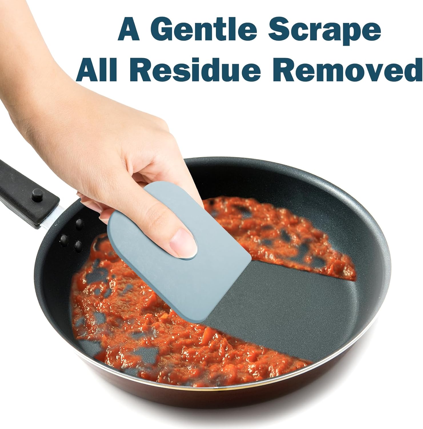 • All-Round Cleaning - Stiff and sharp edges of these kitchen scrapers are able to scrap the food residue in your pan, pot, plate or other cookware without leaving scratches; designed with 4-size angles, the pan scraper tool to can flexibly reach corners and crannies to make a thorough cleaning