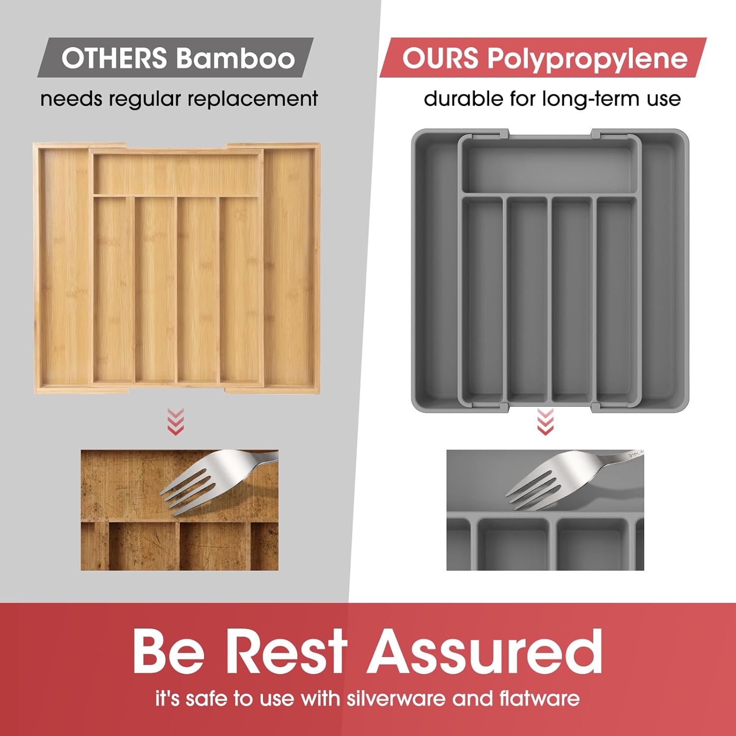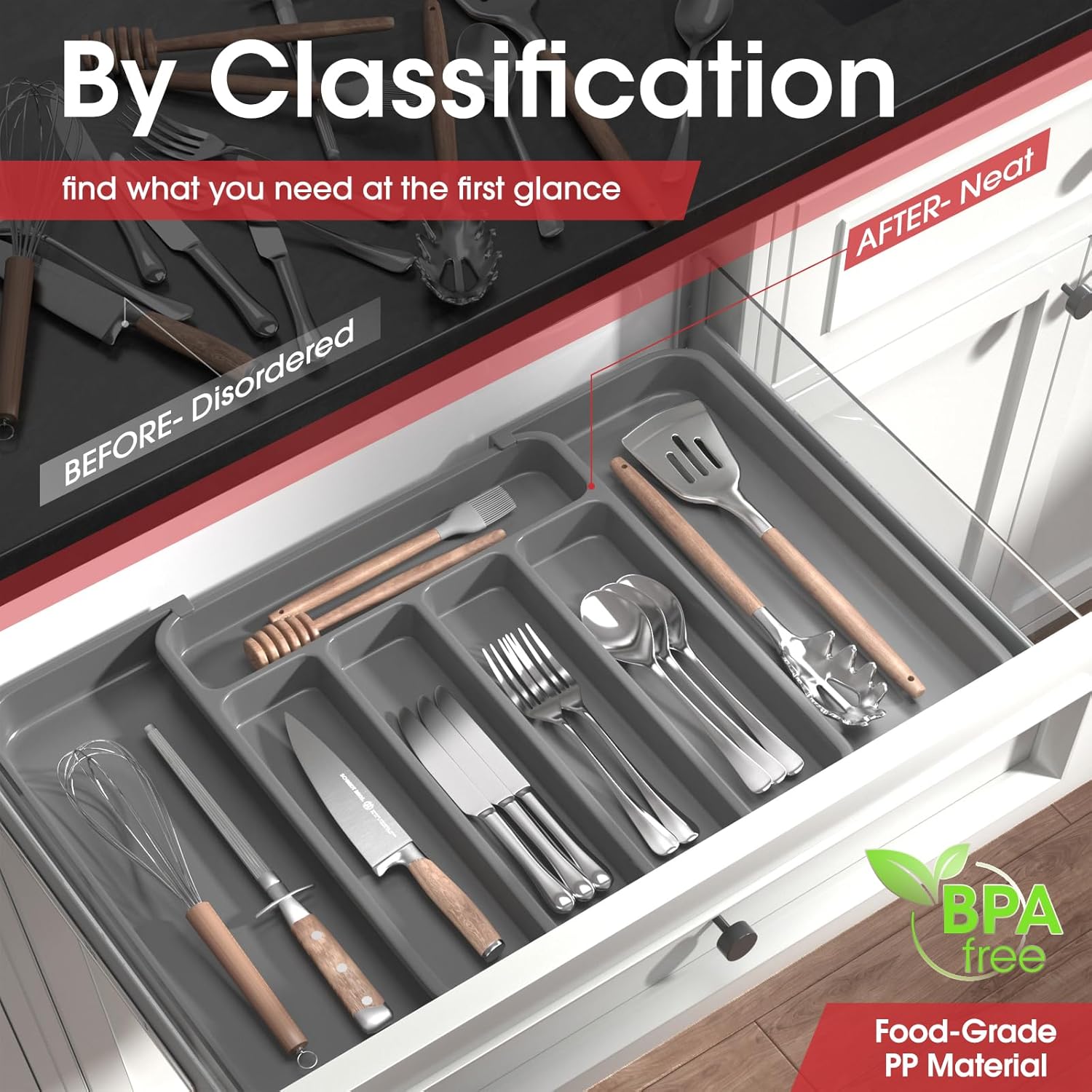 - SAFETY MEETS DURABILITY: AUJEN drawer organizer for kitchen utensils is crafted from premium PP material that is BPA-free and durable for use. Just rest assured that it can guarantee the safety of all your utensils, silverware, and flatware. Cleaning is as easy as a breeze - simply rinse with water or wipe with a damp cloth.