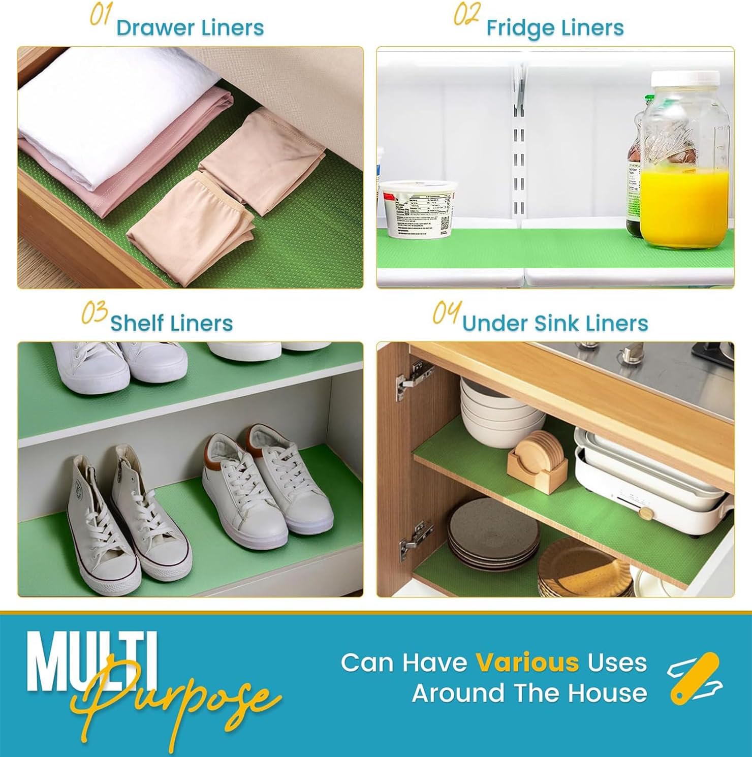 - MULTIPLE FUNCTIONS: Works as fridge shelf liners, drawer liners and cabinet drawer liners - the uses are endless. Our fridge liner is a must have refrigerator accessories for any rv, home and kitchen. Simply cut to size using scissors to fit the liner mats anywhere in your house