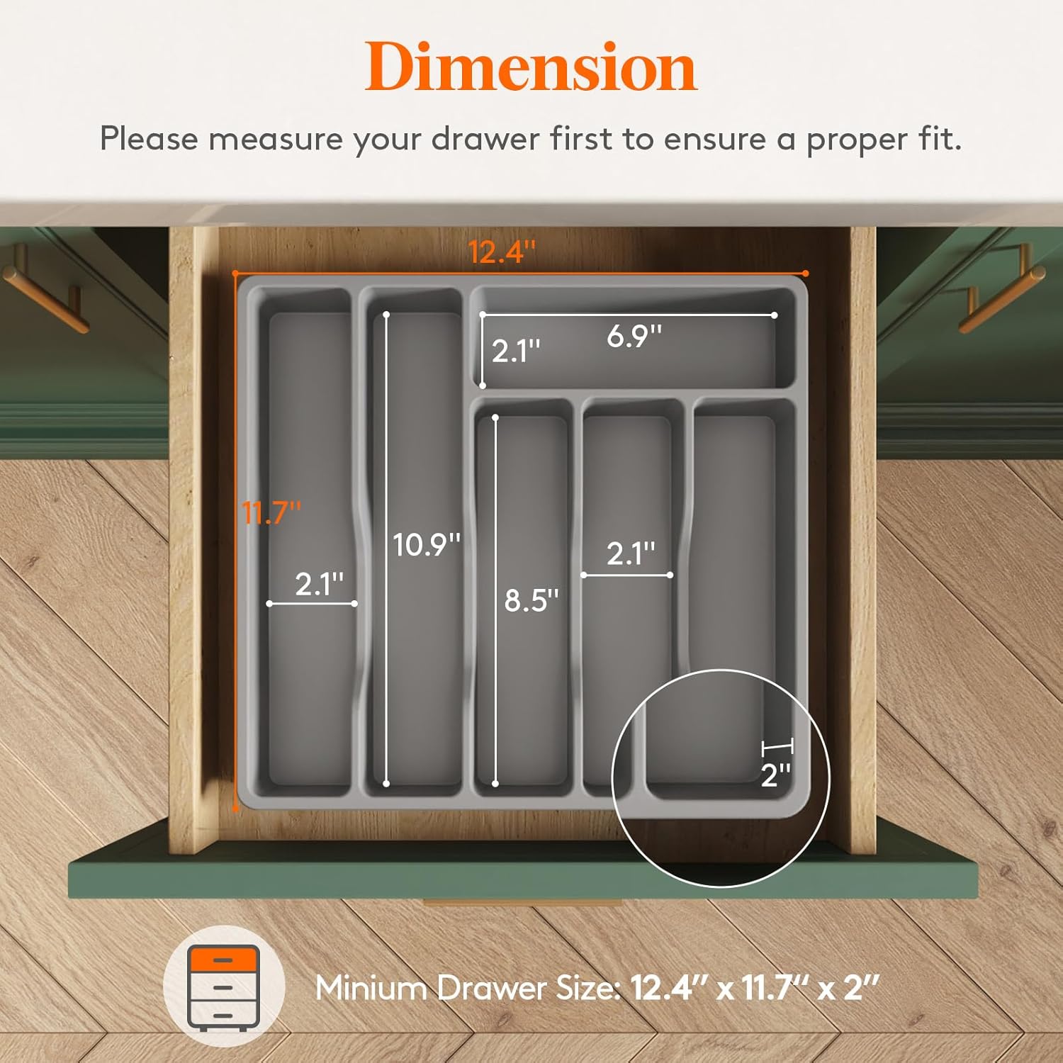 - Fit Most Drawers: Measuring 12.4" x 11.7" x 2" (31.6 x 29.6 x 5.2 cm), the silverware drawer organizer tray easily fits in most standard and small-sized drawers while providing ample storage space.