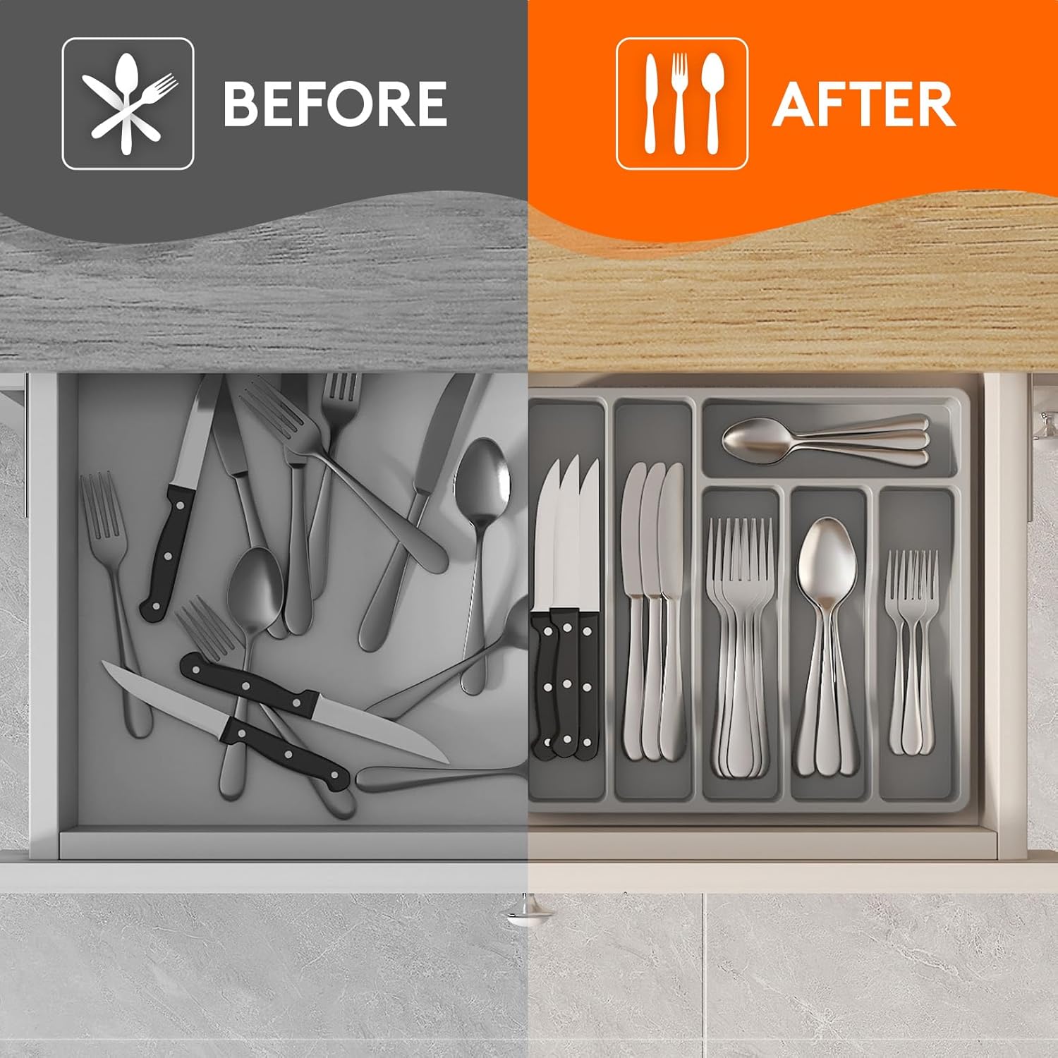 - Sturdy and Safe: The cutlery drawer organizer is made of thick and sturdy food-grade PP material, capable of withstanding daily wear and tear. Additionally, the utensil organizer is BPA-free, ensuring the safety of all types of tableware. Cleaning is a breeze - simply rinse with water to remove any stains.