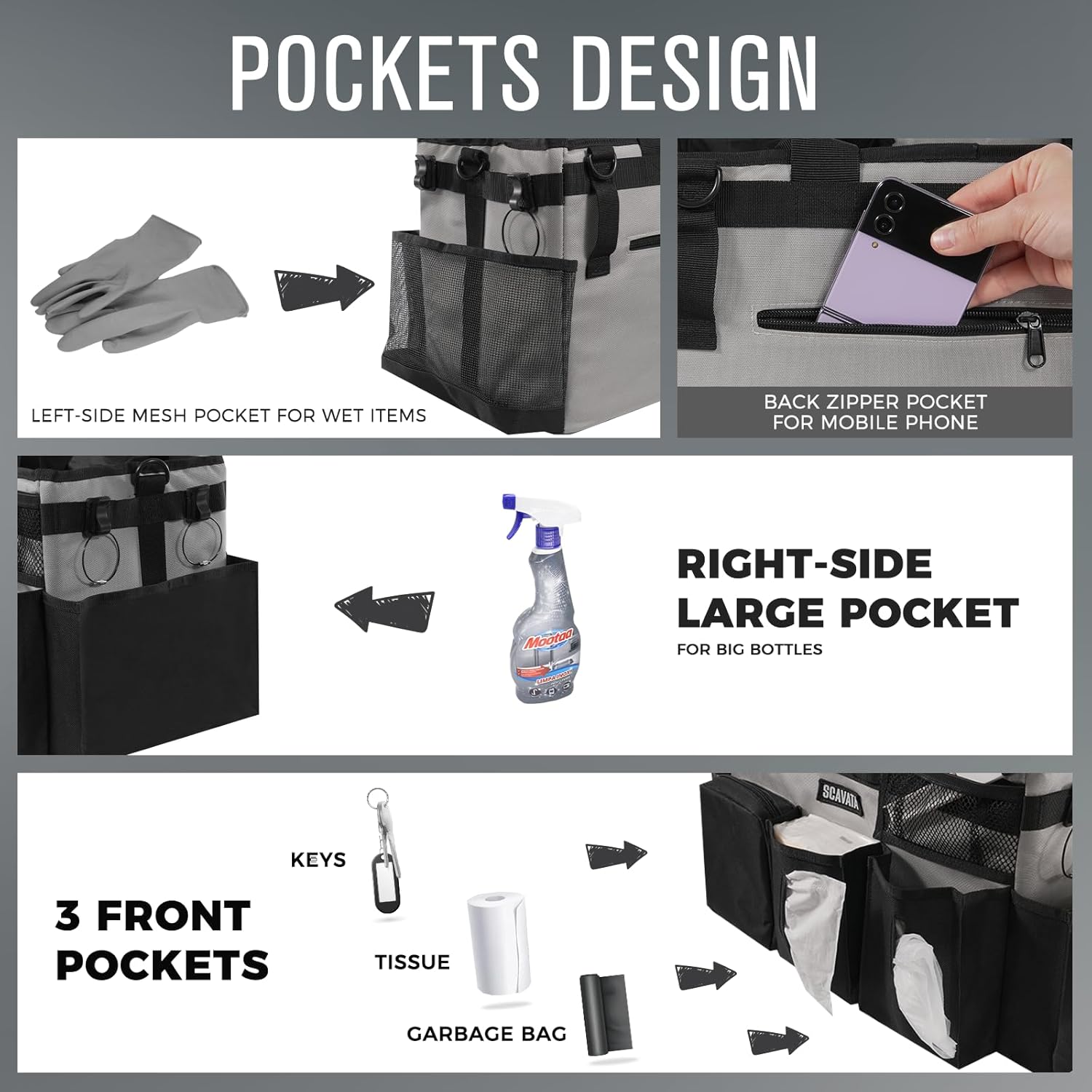 • Exquisite Details: The 5 inner compartments are large enough for organizing cleaning tools. 3 individual deep outer pockets, 1 mesh side pocket and 1 trash bag dispenser allow you storage and access of other cleaning tools. Also, securely zipped pocket is design for safely storing your important items