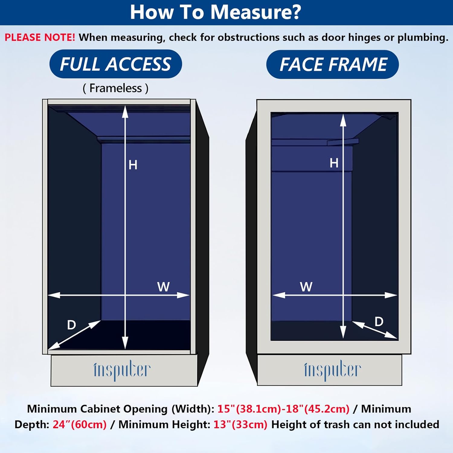 - Easy Installtion: No need to worry about installation difficulties! The under sink garbage can pull out has detailed instructions, installation videos and installation accessories, easy to understand! If you encounter installation problems you can contact us at any time, our customer service staff 24 hours online for you to solve any problem. Note: Please measure the cabinet to make sure the product fits the cabinet. Slide out trash can shelf size: 14.6"W x 22.04"D x 12"H, Fits minimum cabinet size: 15-18“W x 24"D(Should consider the height of the trash can.)