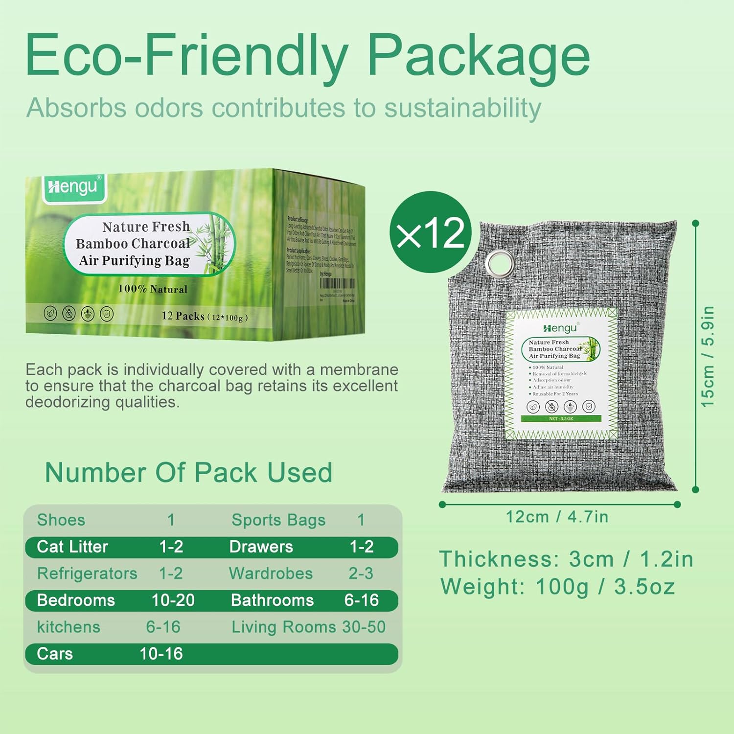 • 【Widely Used】The bamboo charcoal air purifying bag are made from natrual bamboo charcoal. You can use it anywhere such as living room, drawer, closet, shoe cabinet, car, wardrobe, fridge, pet room, sports bag, Etc. Anywhere there is a bad smell, these deodorizers will make it feel like breathing fresh air in nature.