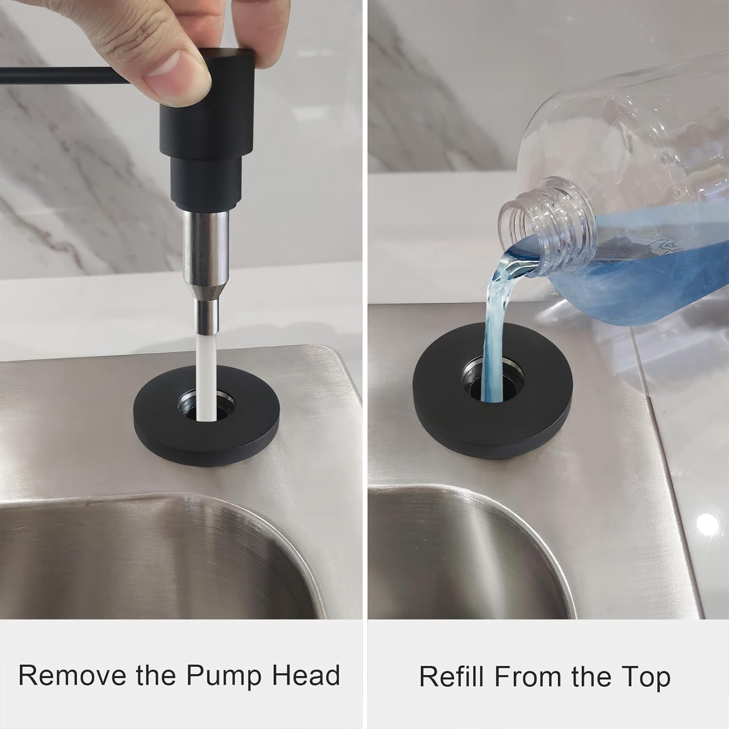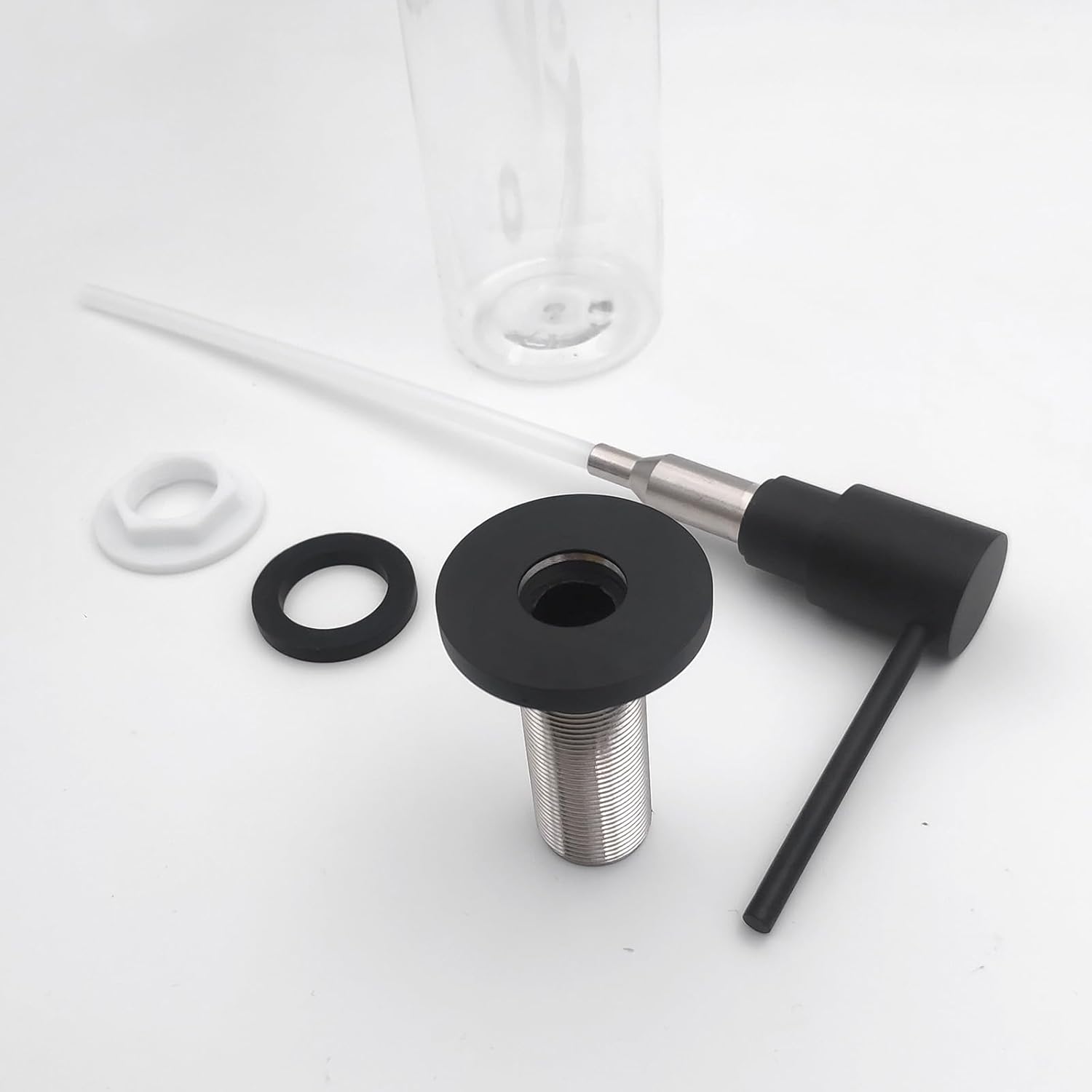 - Built To Last:Sturdy built in sink soap dispenser for kitchen sink,pump head, pump core and threaded tube are made with solid brass, equiped with corrosion resistant spring. It comes with a 17 OZ large plastic bottle. SOLID BRASS CONSTRUCTION Matte black rust resistant finish that will not tarnish as time goes on. The heavy soap dispenser pump mechanism is designed for long lasting excellent performance to dispense consistently with each and every press. Matching perfectly with most faucet models from different brands.