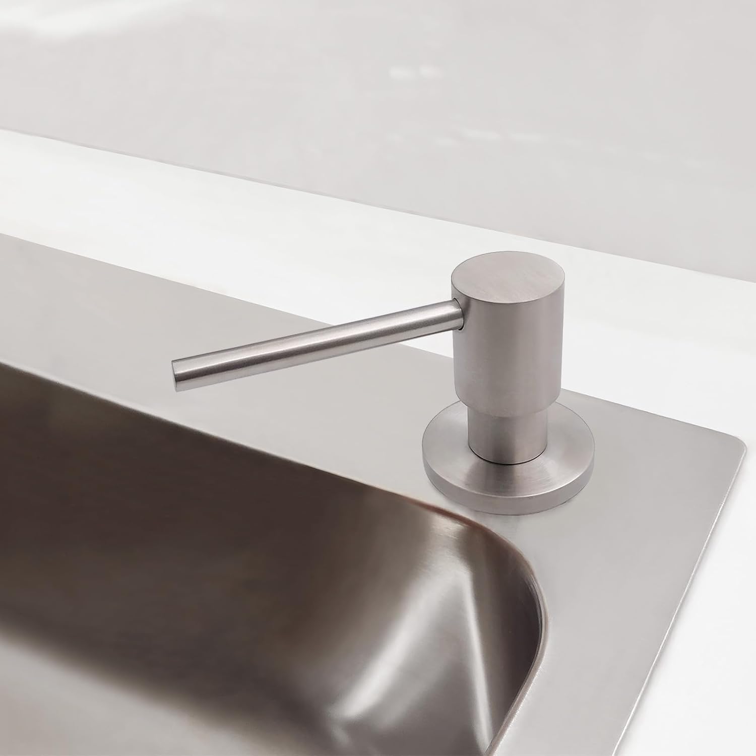 - ️Built To Last:Sturdy built in sink soap dispenser for kitchen sink,pump head, pump core and threaded tube are made with solid brass, equiped with corrosion resistant spring. It comes with a 17 OZ large plastic bottle. SOLID BRASS CONSTRUCTION brushed nickel rust resistant finish that will not tarnish as time goes on. The heavy soap dispenser pump mechanism is designed for long lasting excellent performance to dispense consistently with each and every press. Matching perfectly with most faucet models from different brands.