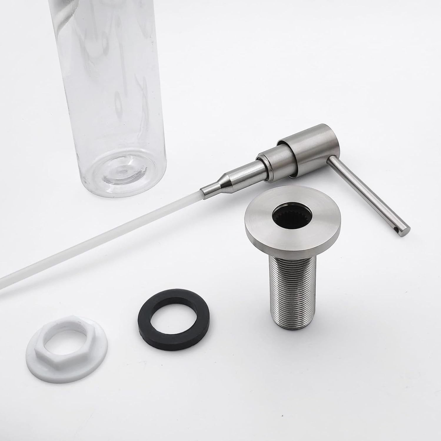 - Package Contents: 1 PET empty bottle, 1 Brushed Nickel Brass pump-head, 1 Washer, 1 Lock nut.