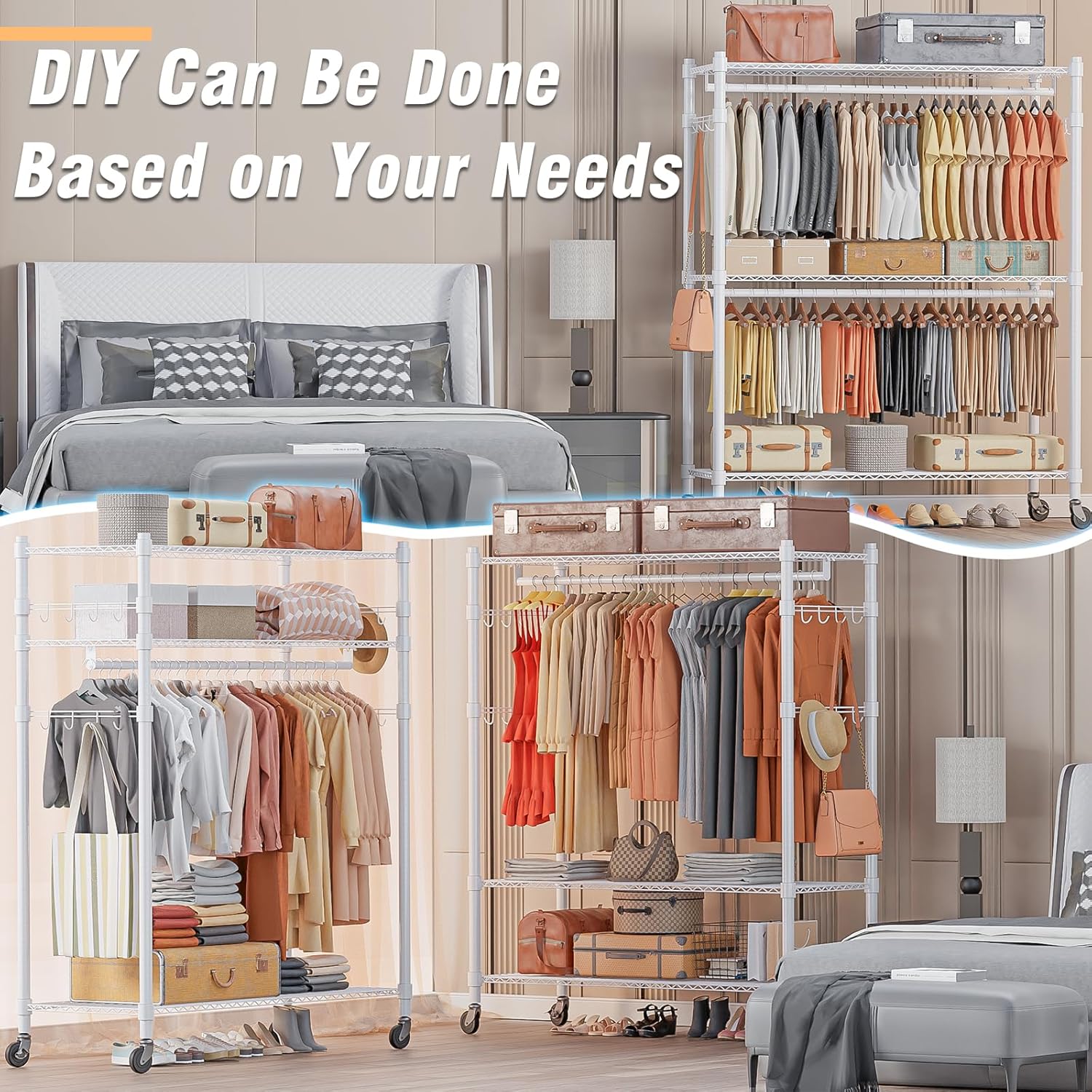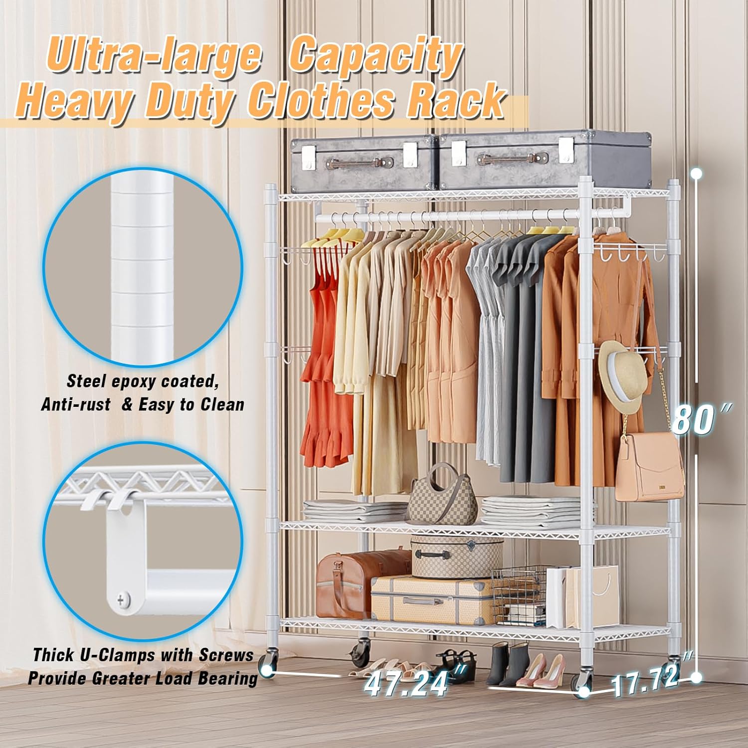 Homdox 3 Tier Garment Rack with Wheels, Portable Closets for Hanging Clothes Heavy Duty, Closet Racks and Shelving with Double Hanger Rods & Side Hooks, White