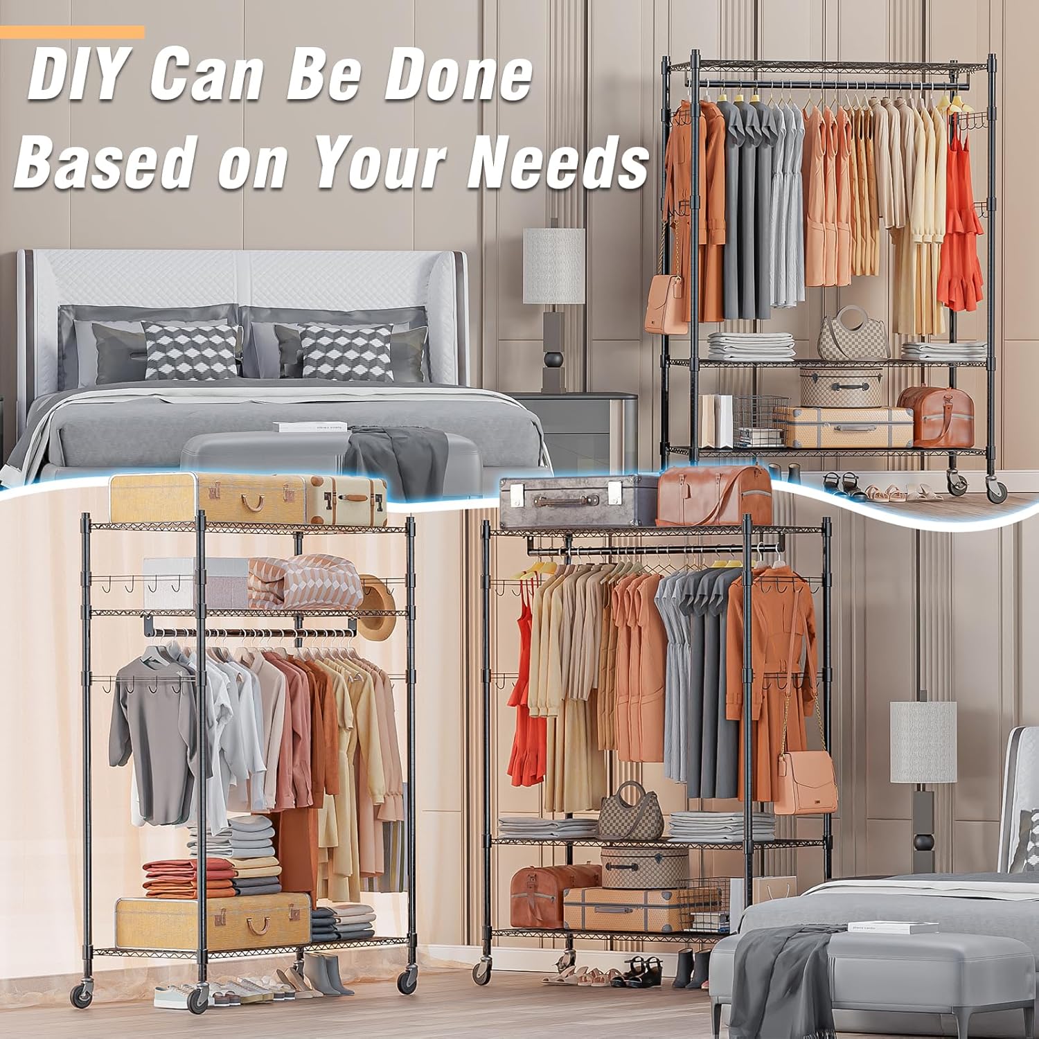 Homdox 3 Tier Heavy Duty Garment Rack with Wheels, Adjustable Wire Clothes Rack with Double Hanging Rods, Portable Closets for Hanging Clothes with Side Hooks, Black