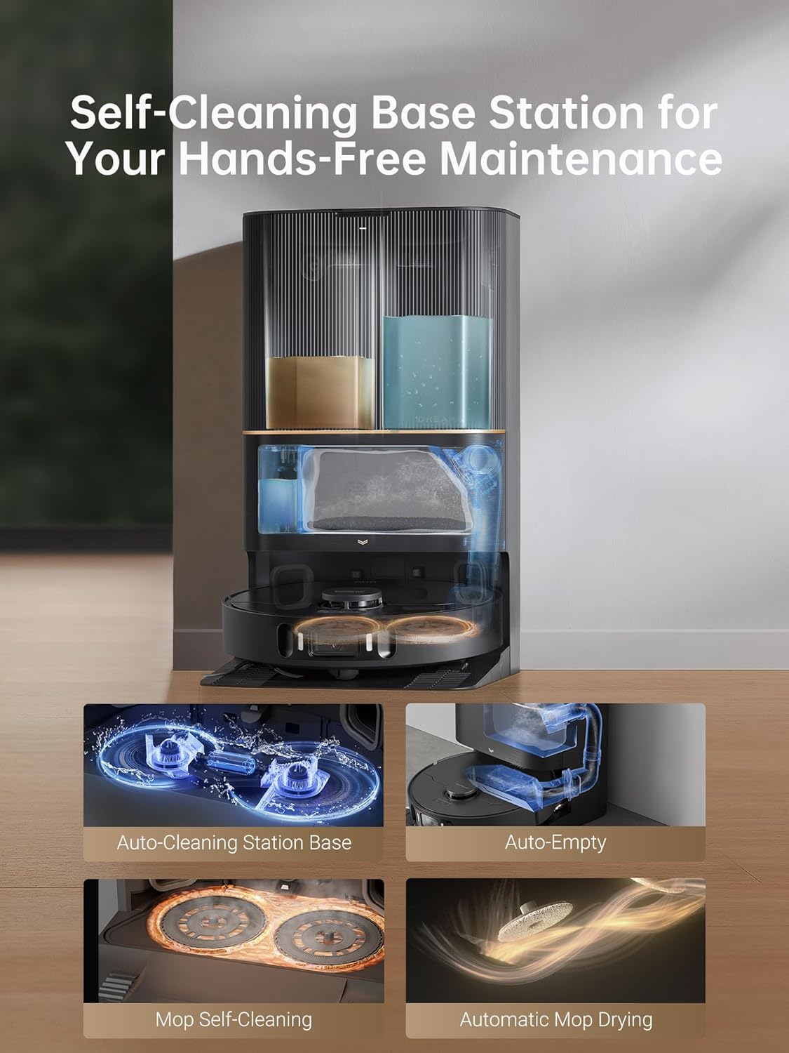 • Auto Maintenance Keeps You Hands-Free: The vacuum can empty its dustbin, refill water for mopping, and wash its mop and the washboard, ensuring continuous freshness and saving you time on cleaning.