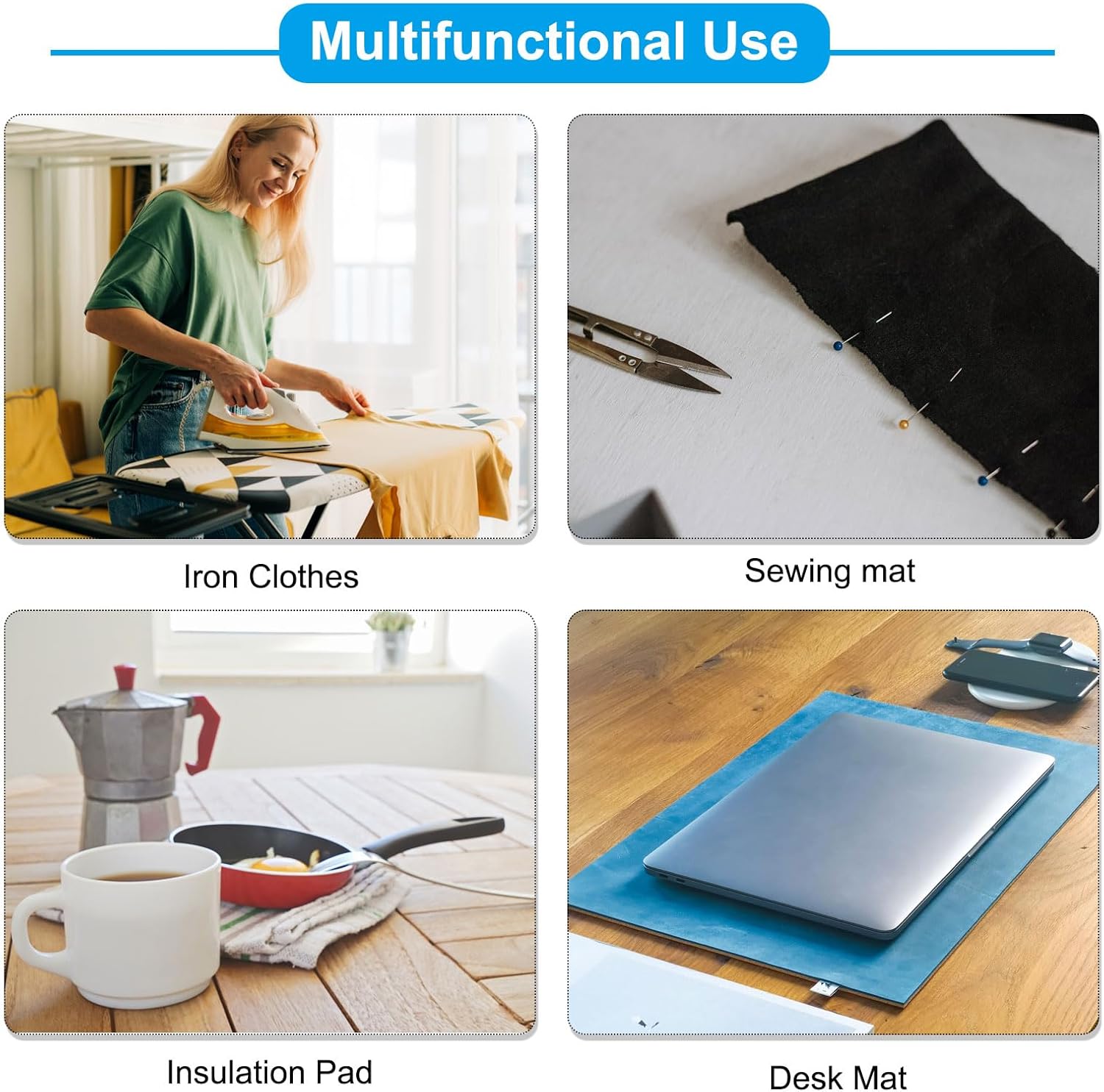 • Instruction Widely Used. In addition to being an ironing mat, the wool pressing mat for quilting can also be used as a sewing mat, also can be placed on the computer table, and can also be placed on the dining table as a heat insulation mat to protect the dining table.