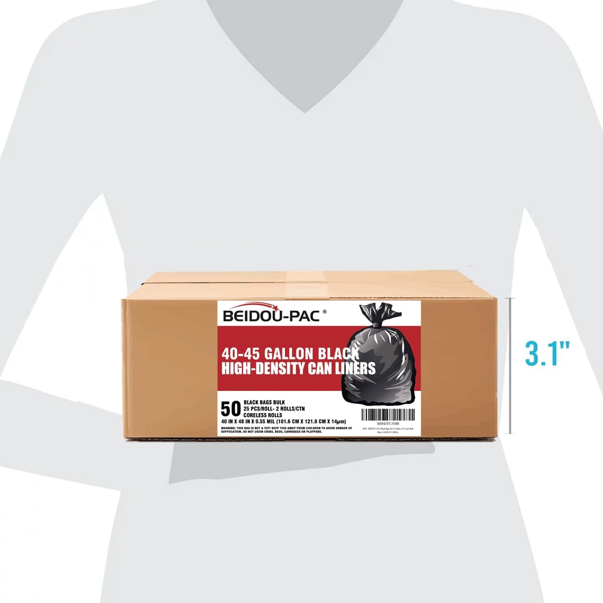 • 1, Product information: BEIDOU-PAC 40-45 gallon large balck plastic recycling trash bags, Size: 40" x 48"x 14 mic, Total 50 bags bulk (25 PCS/ROLL, 2 CORELESS ROLLS/CTN), Perfect for 40-45 Gal Capacity Office, commercial, industrial, or residential waste.