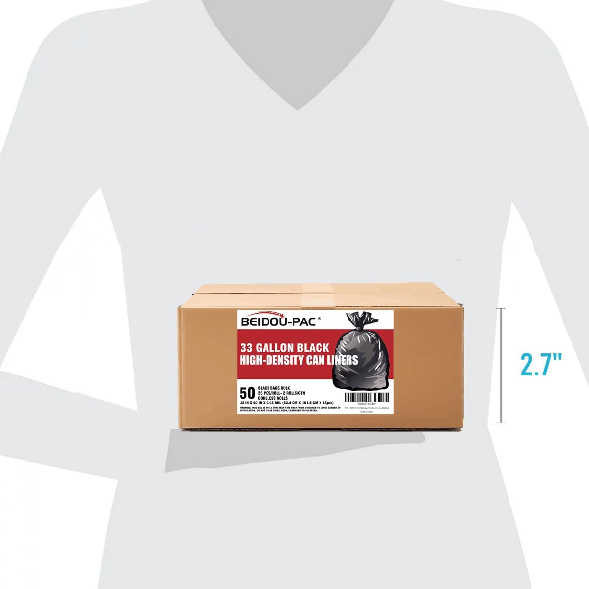 • 1, Product information: BEIDOU-PAC 33 gallon balck plastic can liners, Size: 33"*40"x 12 mic, Total 125 clear bags bulk (25 PCS/ROLL, 2 CORELESS ROLLS/CTN), Perfect for 33 Gal Capacity Office, commercial, industrial, or residential waste.