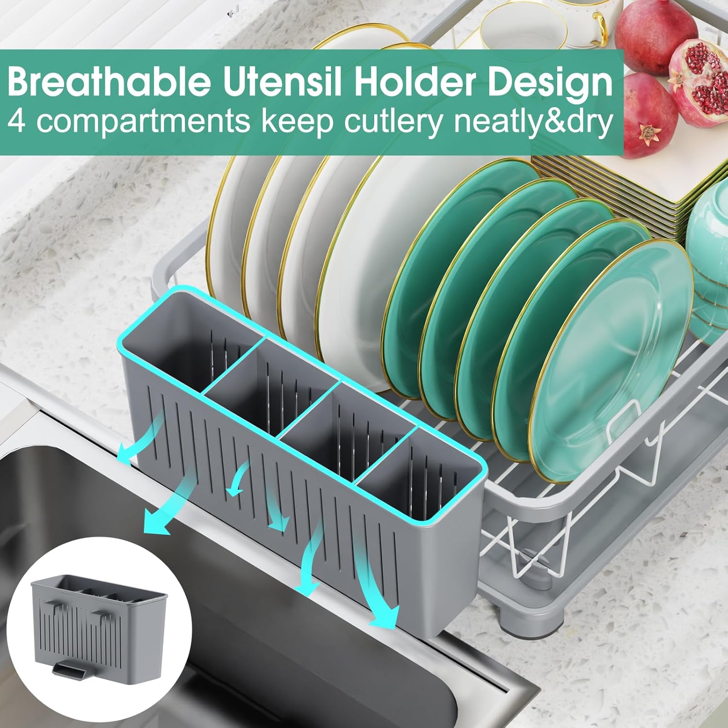 Dish Drying Rack - Space-Saving Dish Rack,Dish Racks for Kitchen Counter with Drainboard, Rustproof Dish Drainer with a Removable 4-Compartment Utensil Holder,Gray