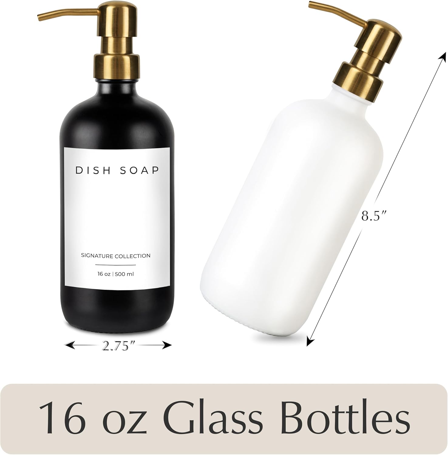 - ✅ 2-in-1 COMBO: Upgrade your home with our glass soap dispenser set. The dish soap dispensers are crafted from the highest quality glass and can be used as soap dispensers for kitchen sinks, soap dispensers for bathrooms, or as hand soap dispenser of your favorite liquid. The kitchen soap dispensers come with 2 dish soap dispensers for kitchen bottles (16 ounces), 2 stainless steel pumps, and 5 waterproof labels. Our selection includes colors including amber, clear, white, and black.
