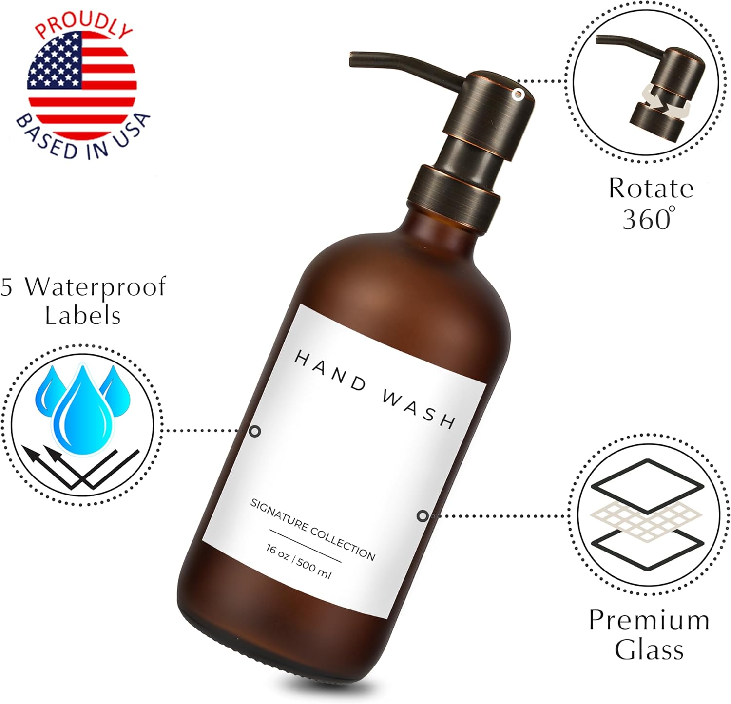 • ✅ 5 WATERPROOF LABELS: Now with 5 stickers, it's your choice to use the Kitchen Soap Dispenser Set with Dish Soap for hand soap, dish wash, lotion, conditioner, or shampoo. To clean the lotion dispenser set for the bathroom and kitchen sink soap dispenser set, just run the bottle under water and watch any residue simply wash off. With our exclusive no-leak pump, the bottle enables you to put out a good amount of soap with a single pump.