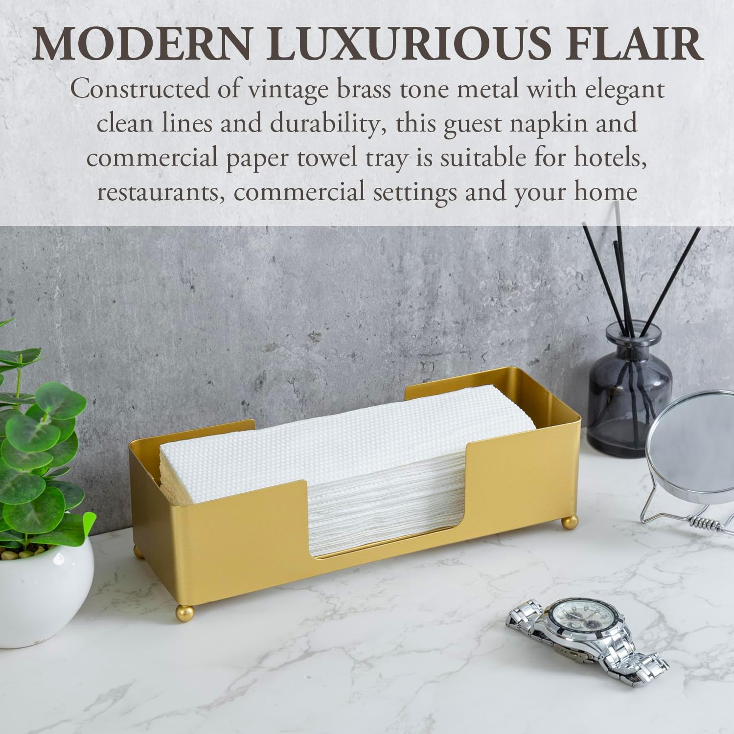 • Modern brass tone metal tabletop paper towel holder dispenser perfect for stylishly storing paper towels in any home, office, restaurant or retail bathroom setting