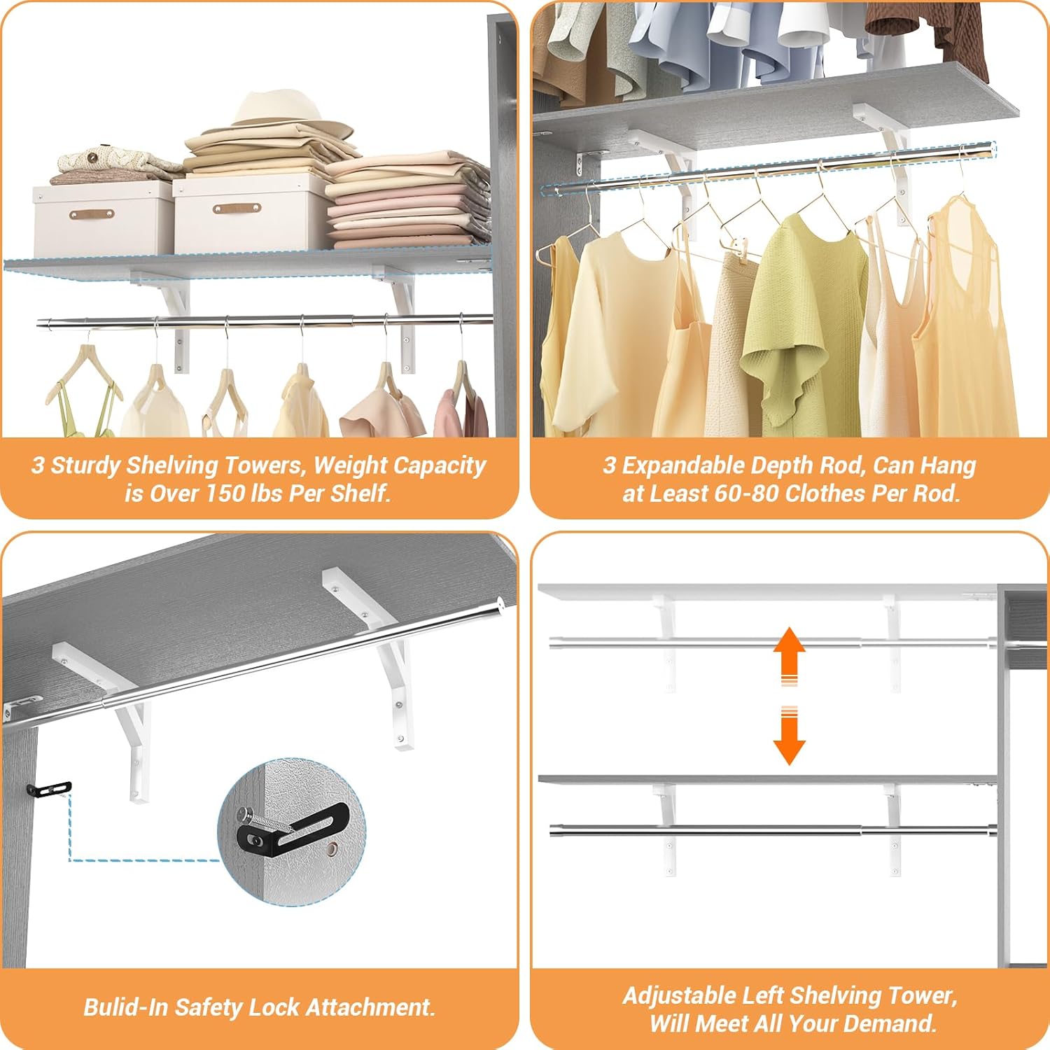 - 【8FT Closet System with 4 Storage Shelves】This closet system has a lot of storage space, it has 4 storage shelves, 3 top shelving towers which creates a custom closet system for you. You can put your clothes, bags, suitcases, socks etc. It can hold about 300+pcs of clothes.
