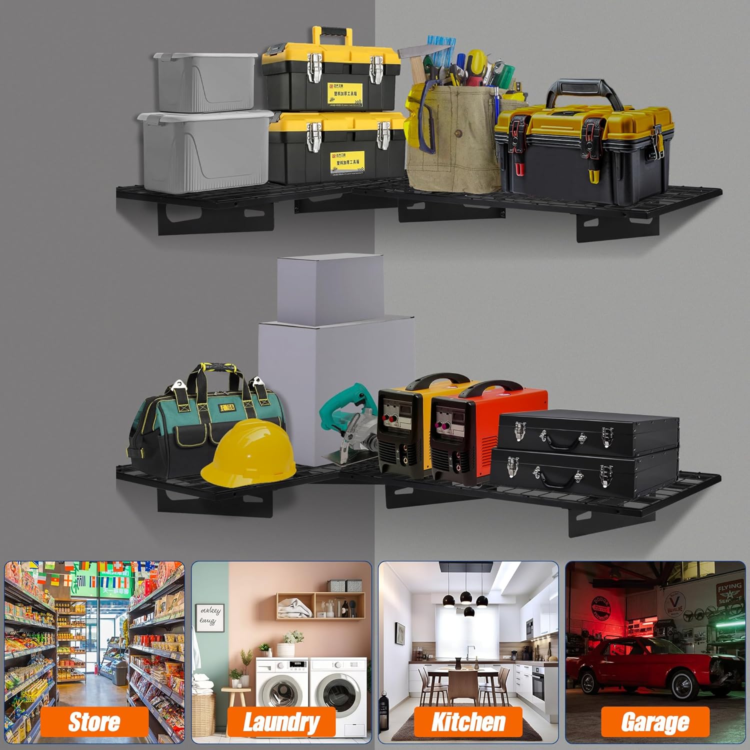 • Solid & Heavy-Duty Construction: Garage wall mount shelving is made of high quality steel with powder-coated finish. With a load capacity of 400 lbs total, they can handle almost everything from power tools to sports gear, providing versatile storage solution for any garage.