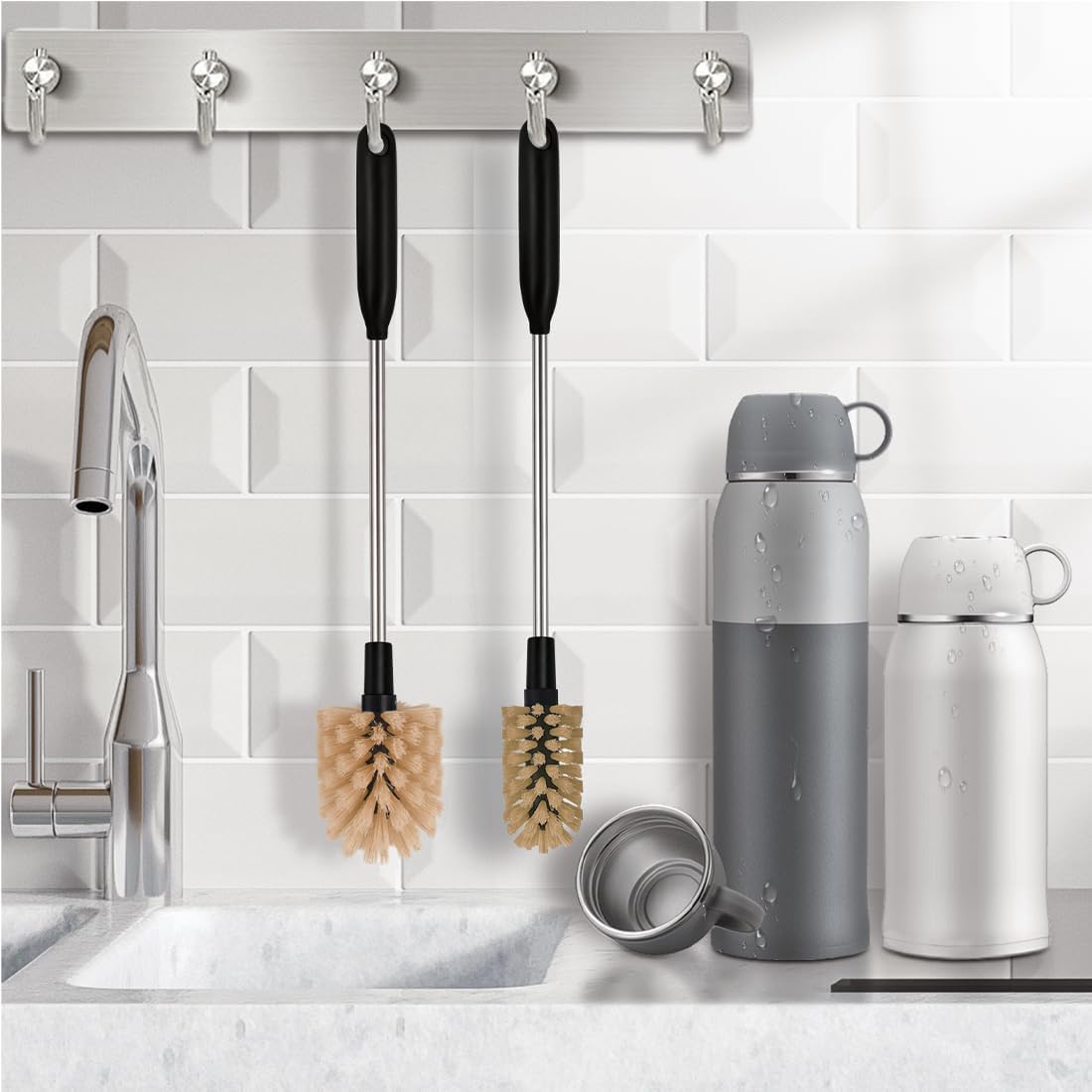 2-in-1 Long Handle Bottle Brush - Water Bottle Cleaning Accessories - Flexible Scrub Brush for Water Bottles,Mugs, Glasswares - with Replacement Brush Heads,Dishwasher Safe Reusable,Brown