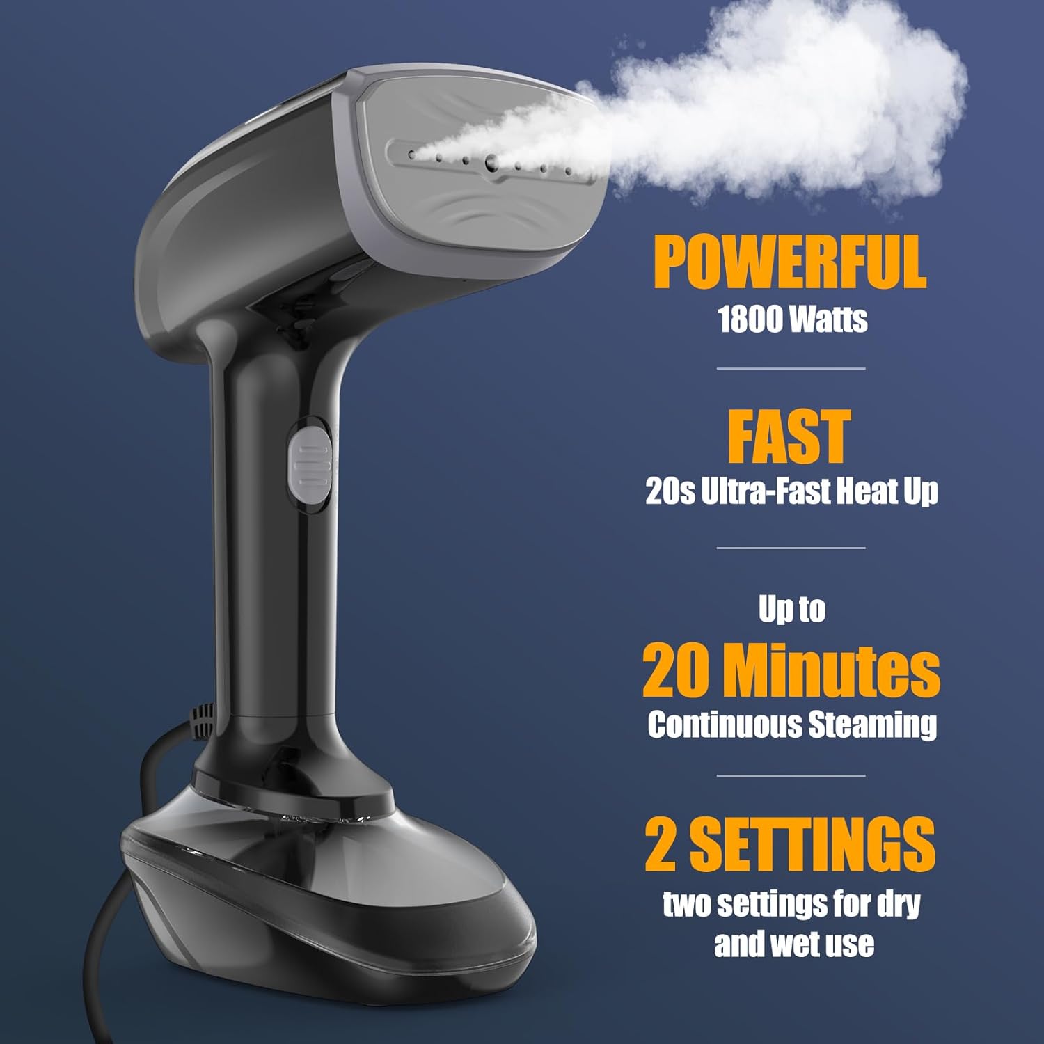 Powerful Handheld Fabric Steamer - 1800W with Fast Ceramic Heat-Up Plate, 2-in-1 Ironing & Wrinkle Remover, Steam Nozzle, Lint Brush - Black, for US 120V Only