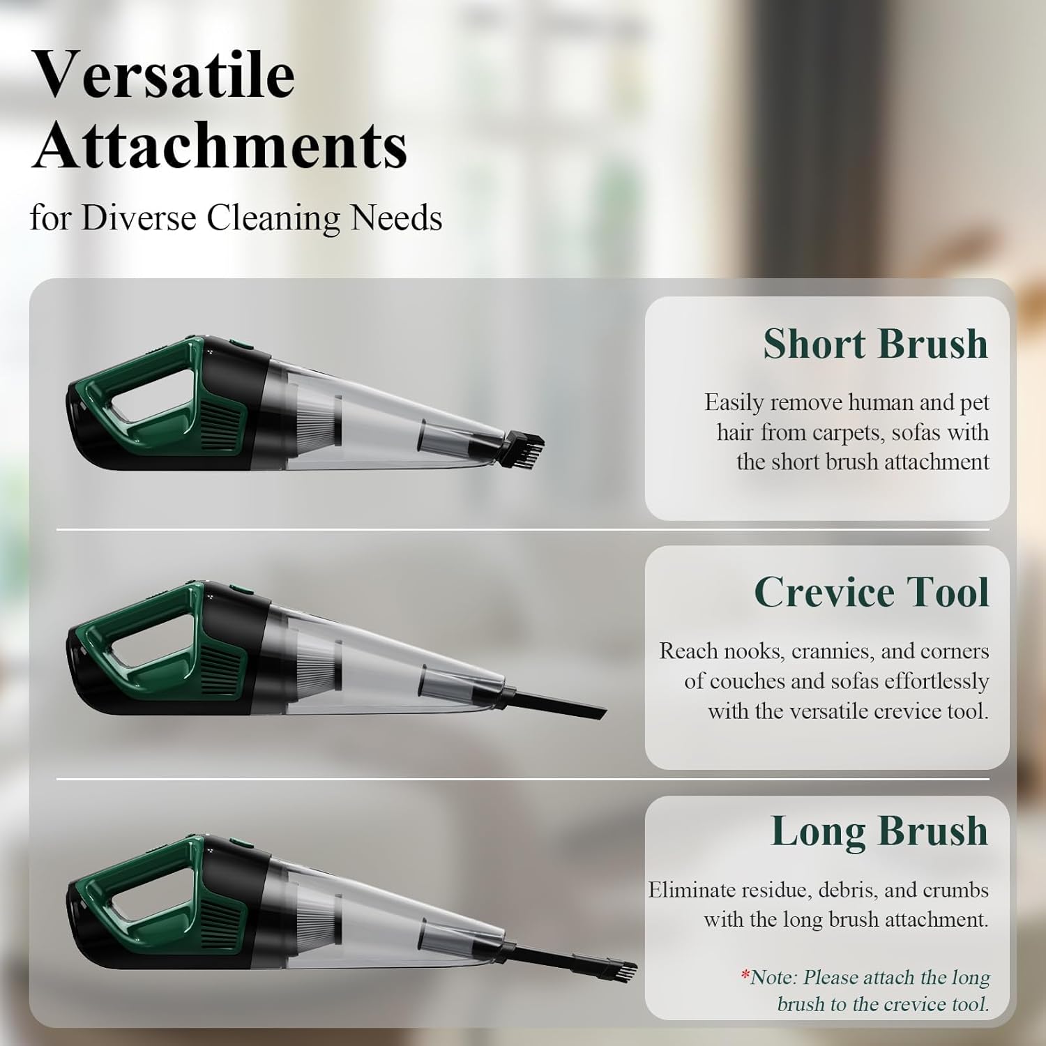 - 【Accessories for Every Cleaning Challenge】From carpets to crevices, the cordless handheld vacuum cleaner is equipped with three versatile accessories to handle any cleaning scenario. The long brush tackles embedded dirt, the short brush swiftly removes dust and pet hair from sofa, carpet, or fabric surfaces, while the crevice tool reaches those tight corners and narrow gaps with ease. Versatility has never been easier.