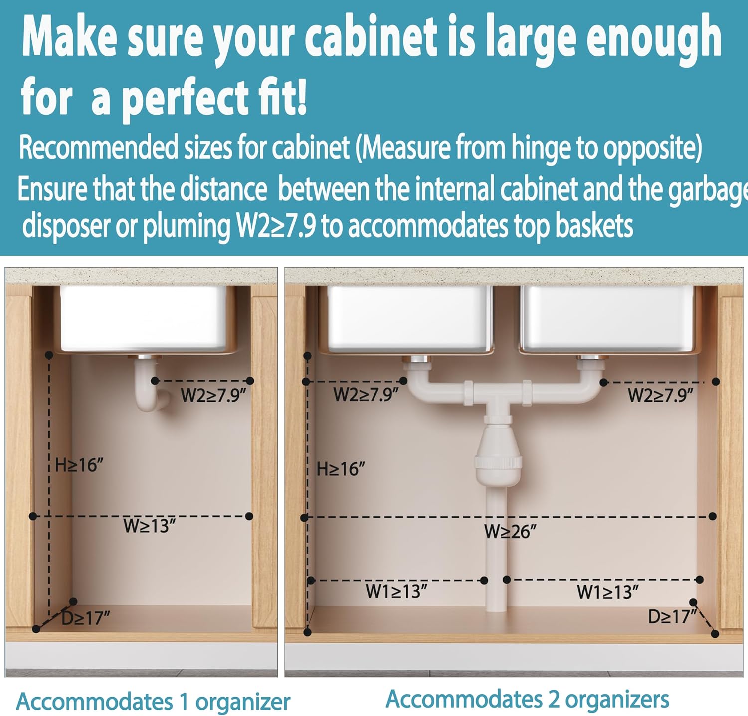 • Applicate Cabinet Size: If placing a sink organizer, the cabinet dimensions would be at least Width:13", Depth:17", Height:16". For two sink organizers, the cabinet dimensions should be at least Width:26", Depth:17", Height:16". And please check for obstructions at back of cabinet ( plumbing, garbage disposal, etc).