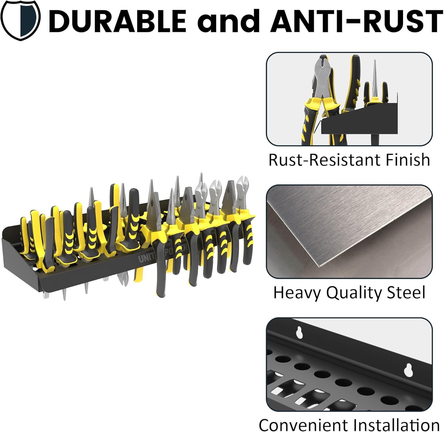 • Durable Material: The pliers Storage Organizer Made of heavy metal with powder coated finish for lasting durability, double-layer design to better fixing tools