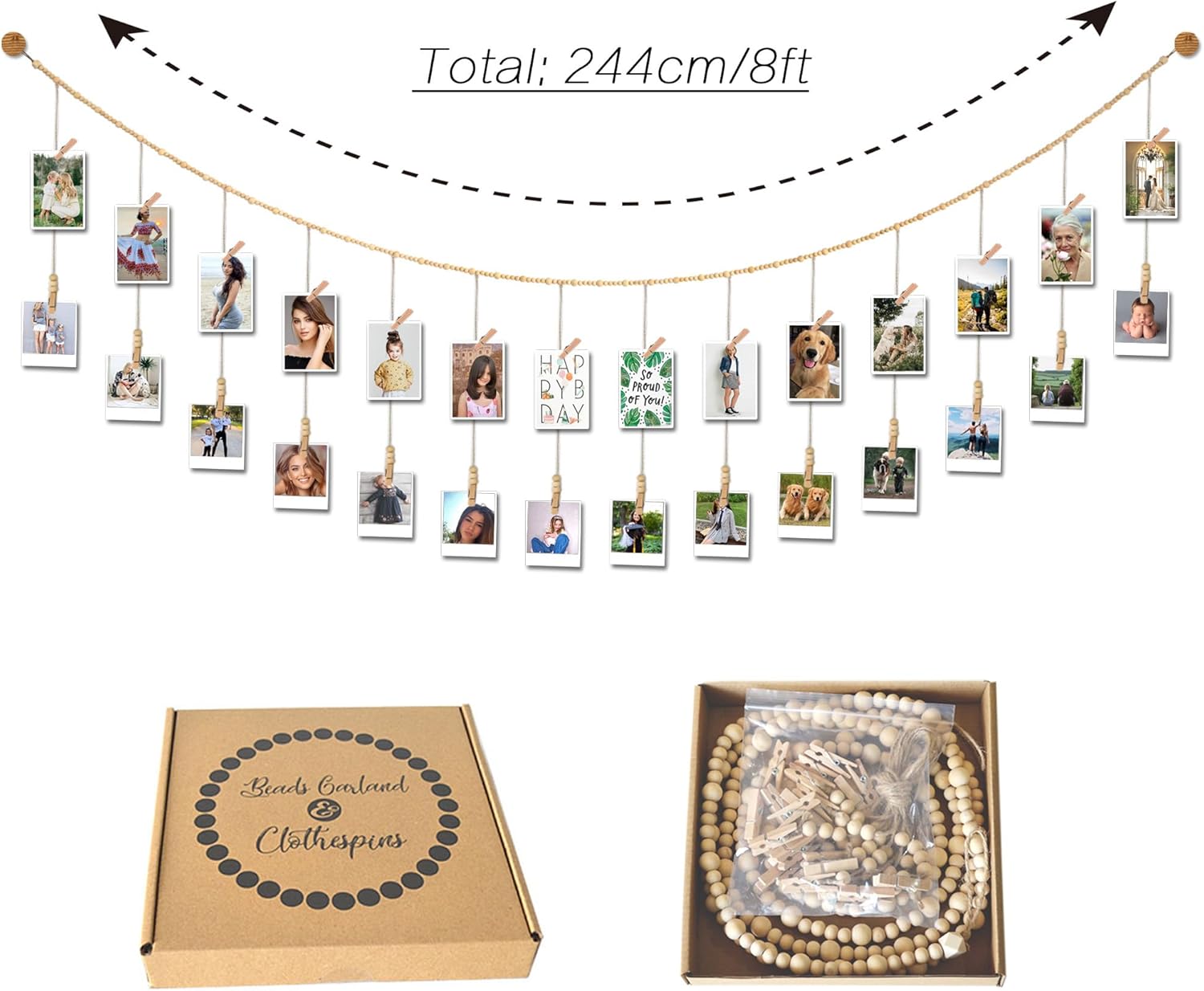 • THE POSSIBILITIES ENDLESS: This beautiful natural wood bead garland with clothespin is perfect for displaying family photos, kids artwork, polaroid photos, homeschool activities, holiday and Christmas cards...