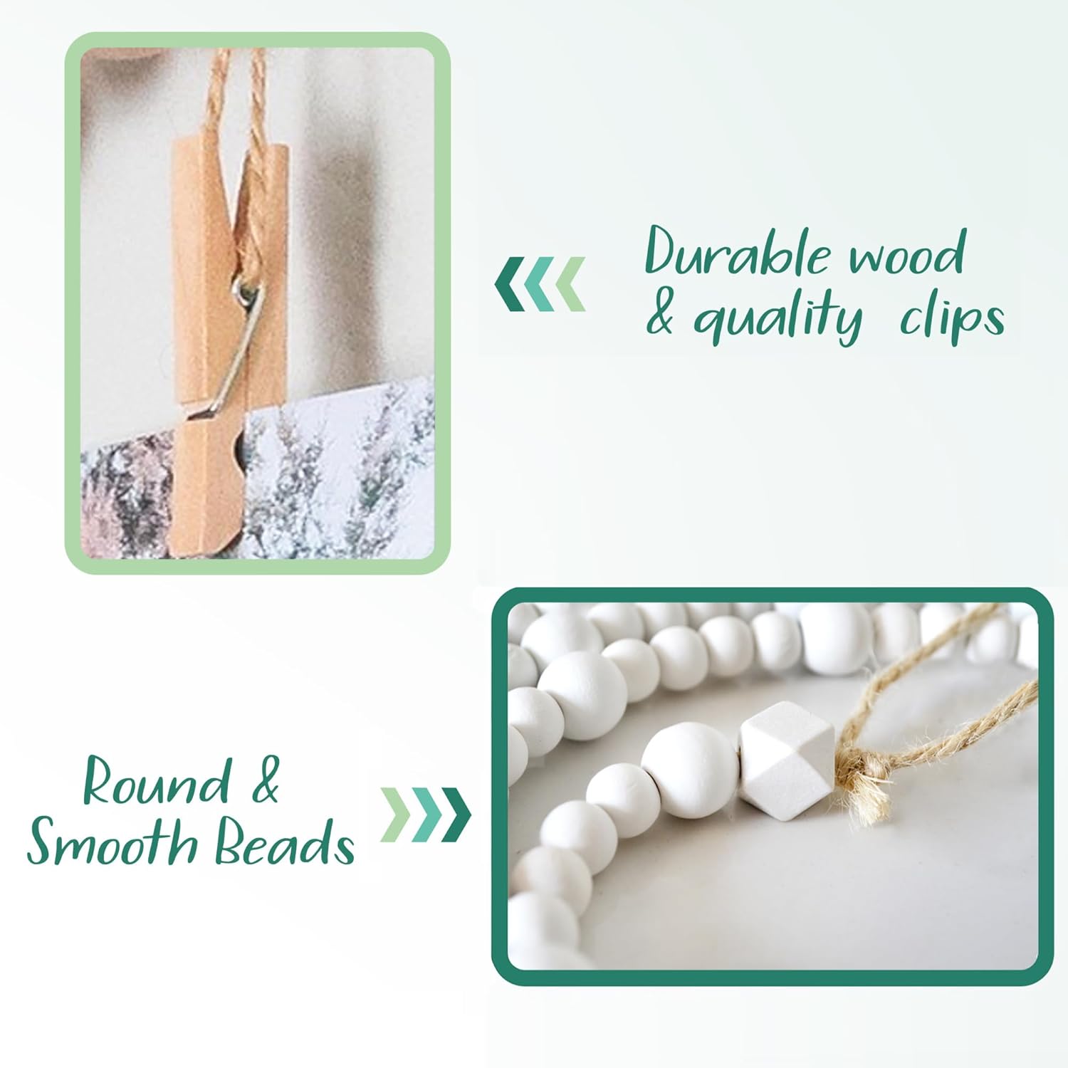 • QUALITY MATERIAL: Made of round wood beads strung together using jute rope with 28 clothespins attached. Approx. 2-loops on each end for easy hanging.