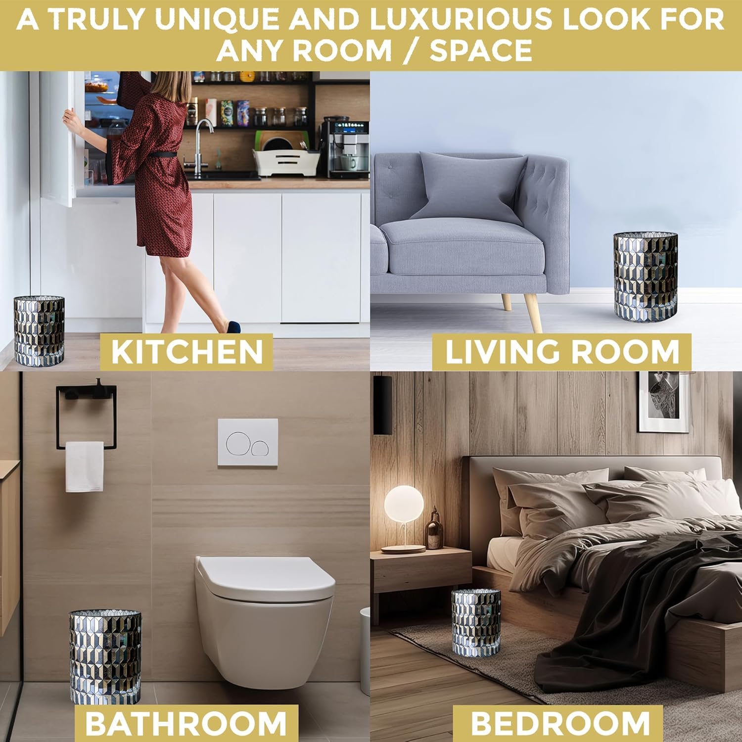 • Premium Small Garbage Can - Our decorative bathroom trash cans are hand-made with a beautiful mosaic glass finish for black/gold-themed decor. A must-have in your new house essentials for a luxurious bathroom experience.