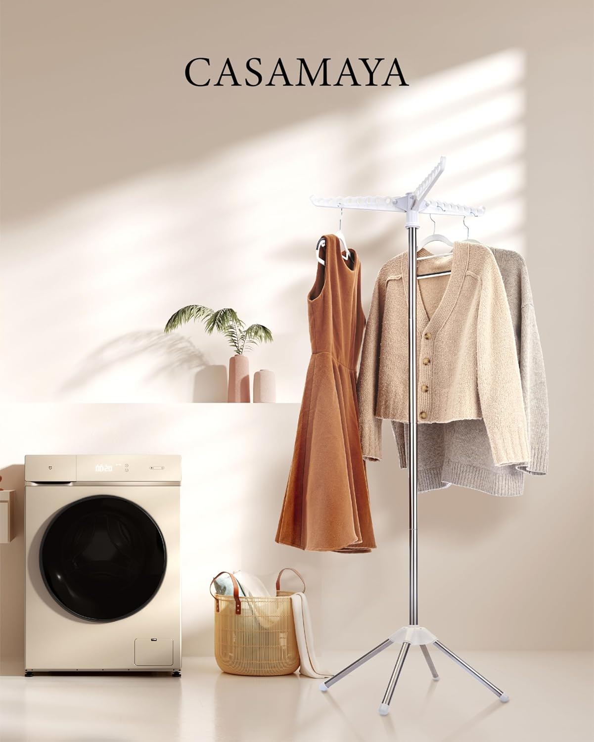 Clothes Drying Rack Foldable, 59 inch Tripod Laundry Drying Rack Indoor with Rotating Clothes Rail for 27 Pieces of Clothes, Space Saving, Stainless Steel, White and Silver CDR001W01