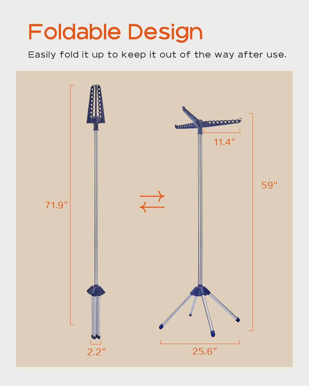 • [Foldable and Space-Saving] This vertical drying rack measures 25.6”D x 25.6”W x 59”H and takes up very little space. After use, simply fold the four legs and three drying rods into a smaller size: 2.2 "D x 2.2 "W x 71.H, which can be leaned against the footrest, perfect for apartment laundry rooms or narrow spaces and corners.