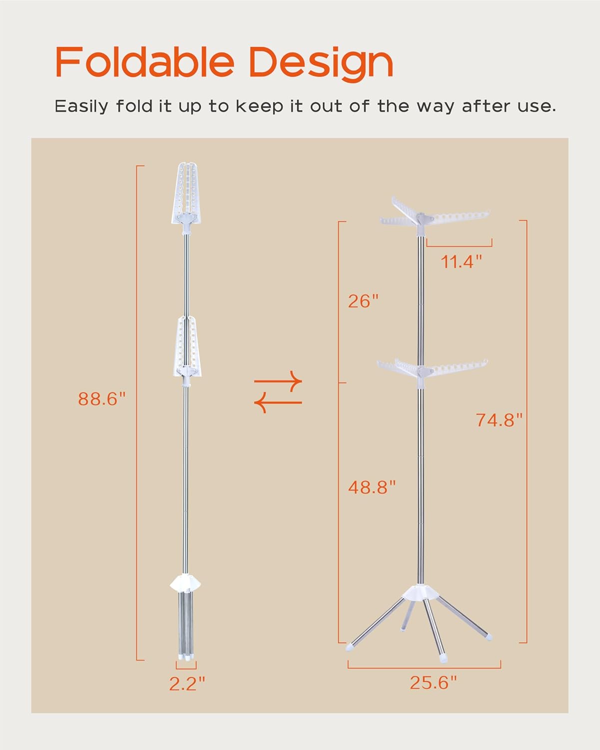 • [Foldable and Space-Saving] This vertical drying rack measures 25.6”D x 25.6”W x 74.8”H and takes up very little space. After use, simply fold the four legs and three drying rods into a smaller size: 2.2 "D x 2.2 "W x 88.6H, which can be leaned against the footrest, perfect for apartment laundry rooms or narrow spaces and corners.