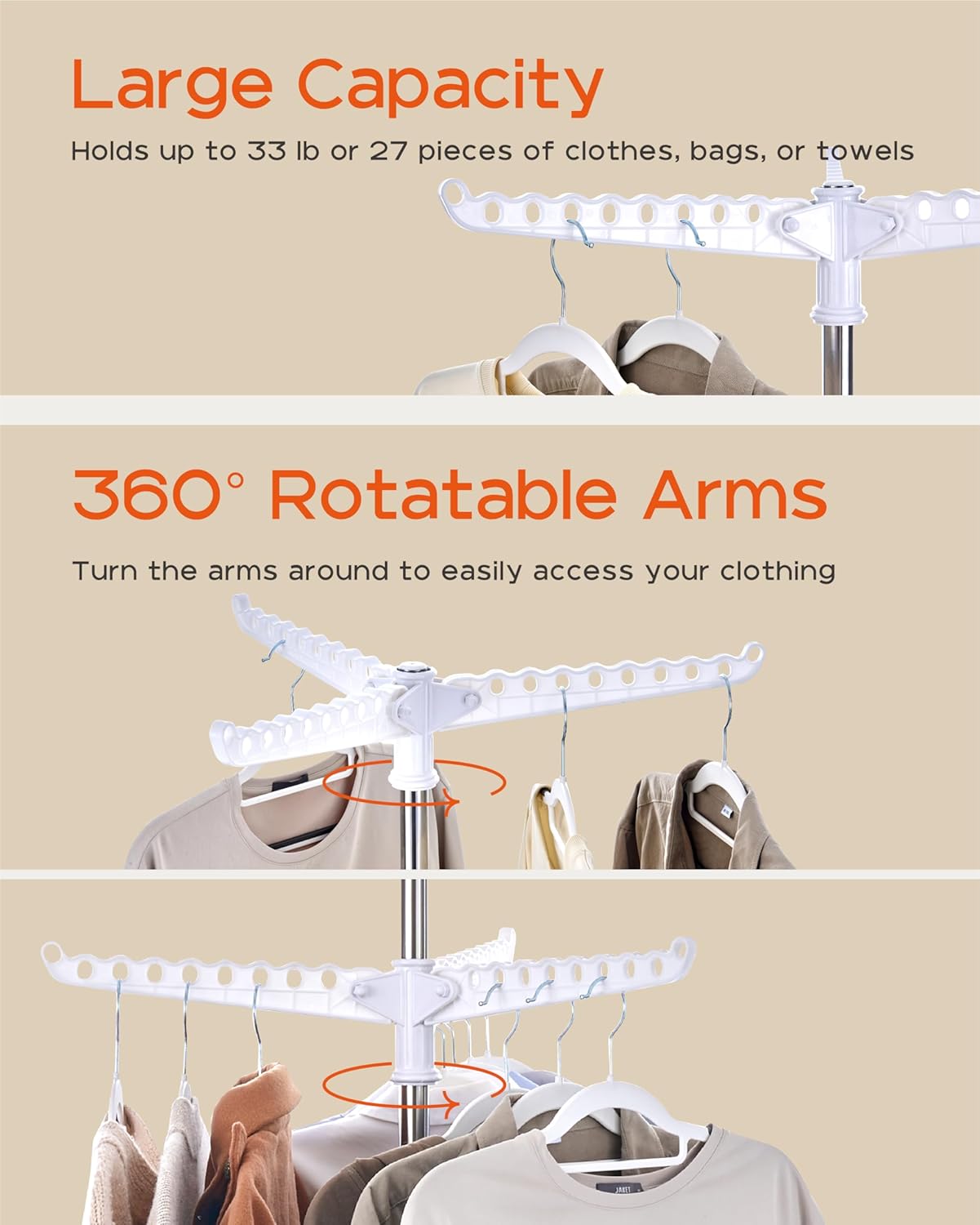 • [Large Capacity] This 2-tier drying rack can holds 54 pieces of clothing or other accessories,three hanging rods are designed with holes to fix the hangers to keep the clothes drying neatly.
