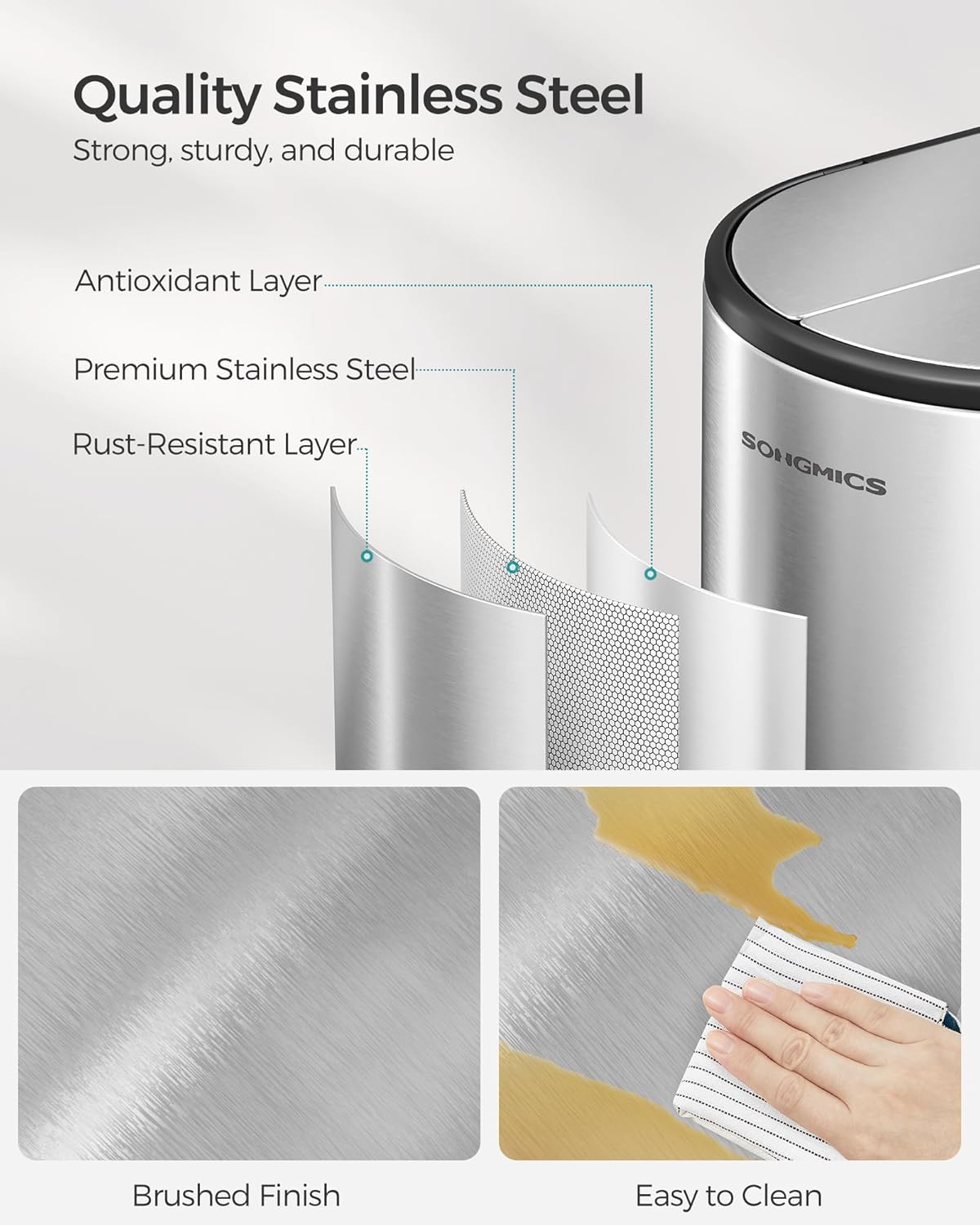 • [Soft Close] This garbage can promote a peaceful kitchen environment with its stainless steel lid that closes silently, eliminating any loud noises or bangs