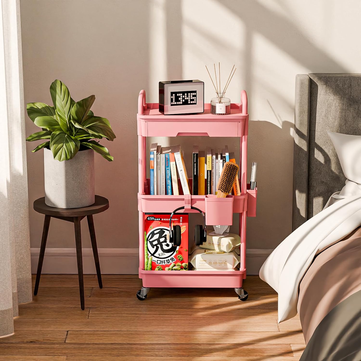 3 Tier Rolling Cart Organizer,Laundry Room Bathroom Organizers and Storage Office Shelves Mobile Shelving Unit Kitchen Trolley Cart with Wheels for Art,Craft,Diaper,Bedside,Snack(Pink)