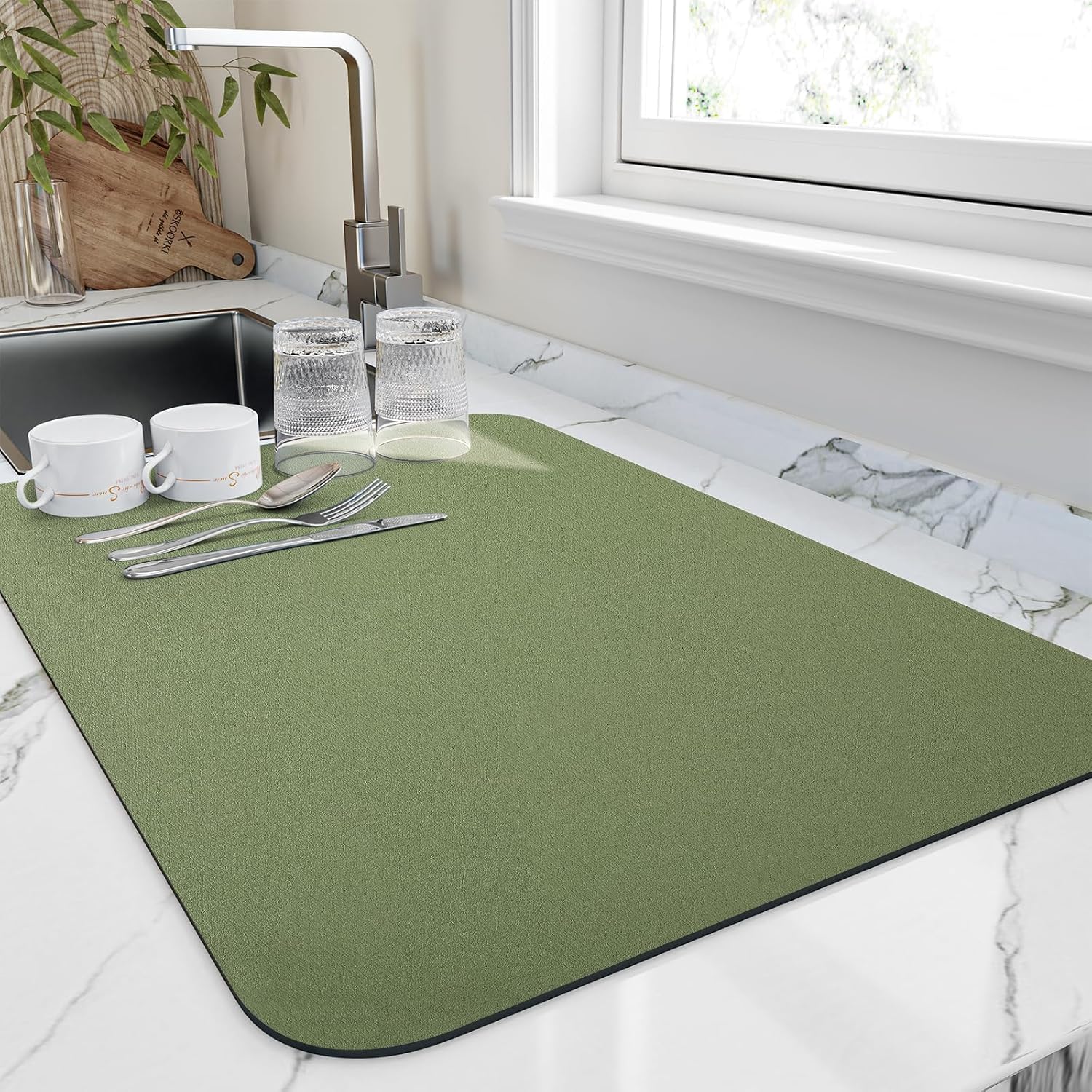 Dish Drying Mat for Kitchen Counter, Heat Resistant Drainer Mats with Non-slip Rubber Backed, Hide Stain Kitchen Super Absorbent Draining Mat, Easy to Clean Dish Rack Pad, Green 18"x32"