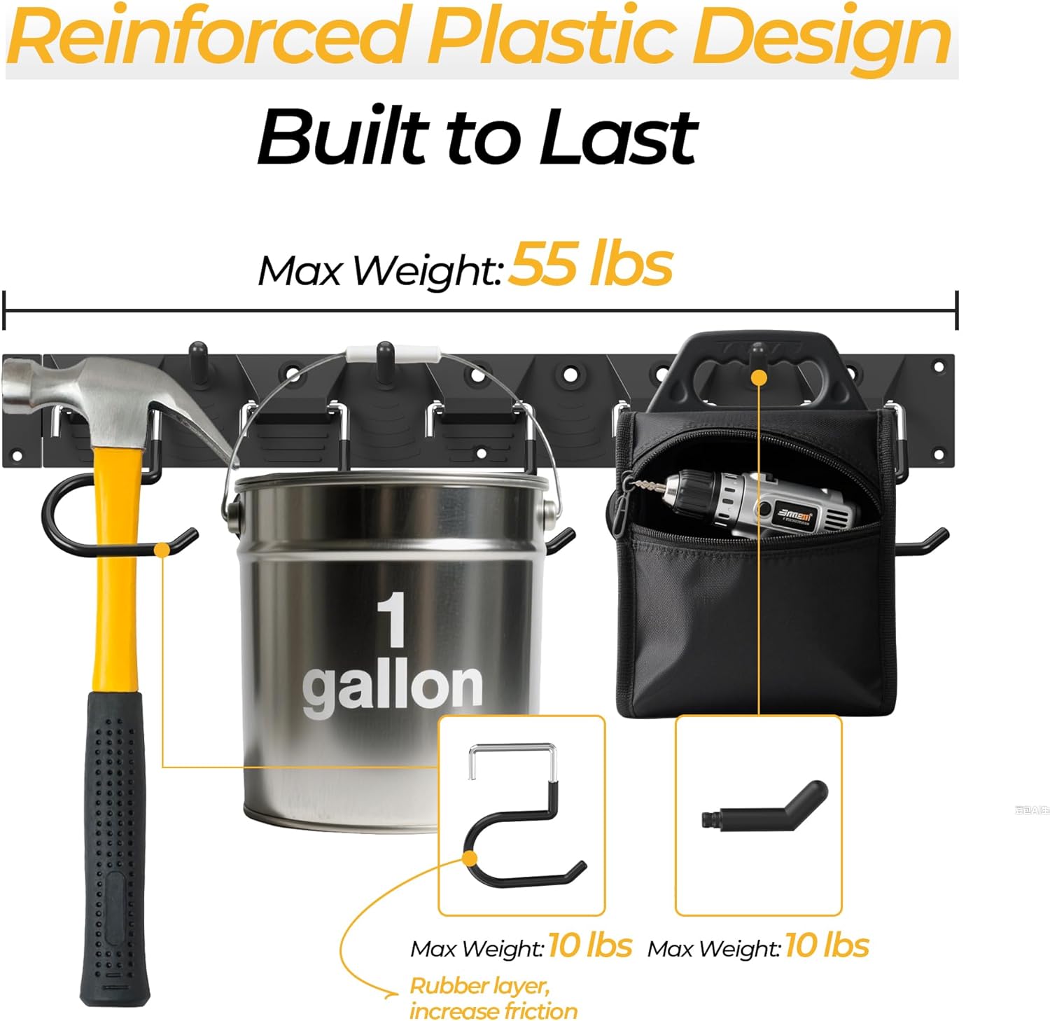 • 【High Strength Structure】 Made of high quality ABS plastic, this wall mount tool organizer supports up to 55 lbs in total (10 lbs per hook), making it ideal for storing heavy duty tools like shovels, rakes, and mops—perfect for any durable garage storage system.