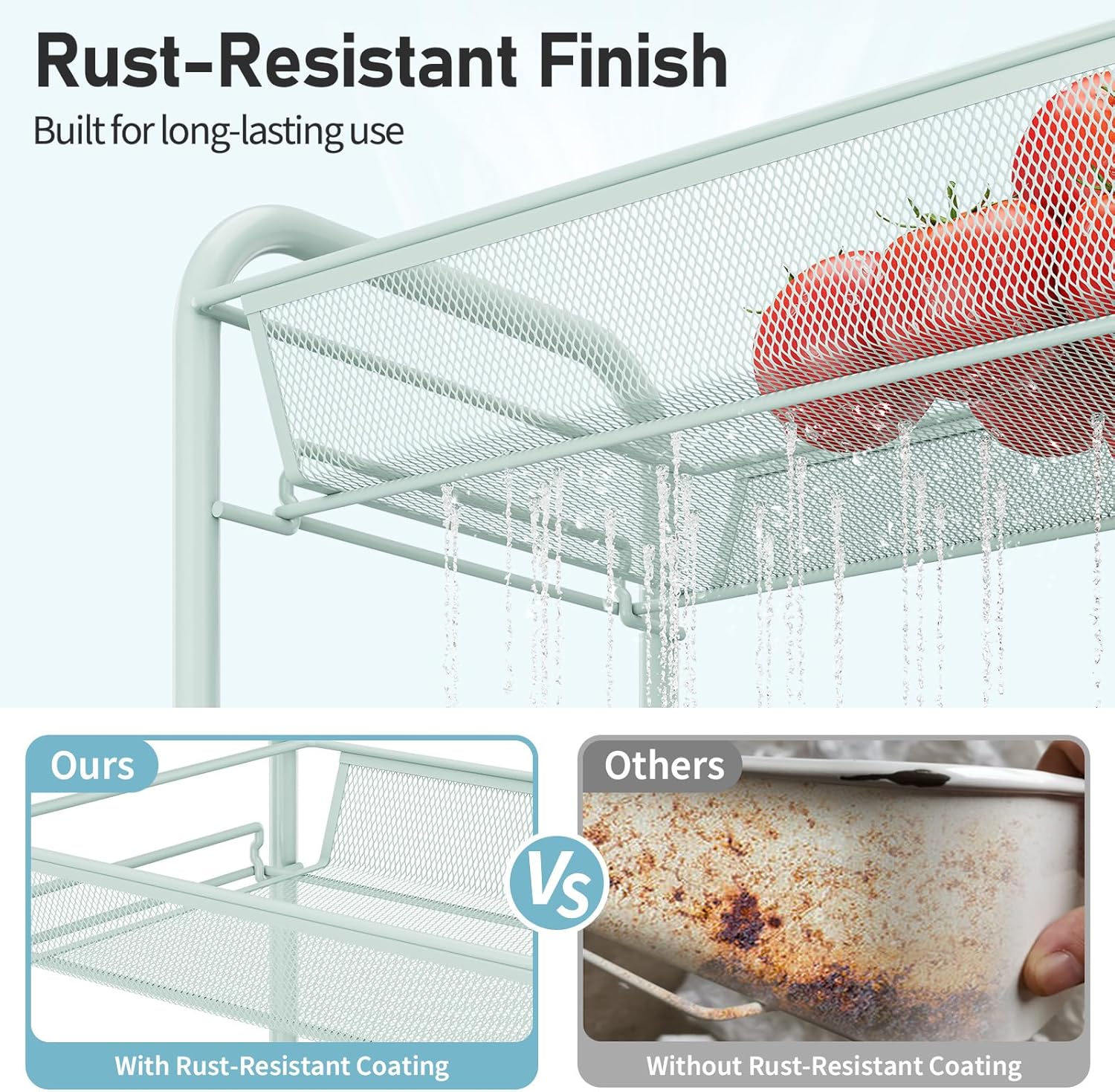 - 【Breathable Mesh Basket】Our rolling utility cart with breathable mesh basket, convenient for draining. Basket with 6cm (2.4") heighten edge to prevent items dropping and with good load-bearing capacity. The weight capacity of each metal basket is up to 5 kg