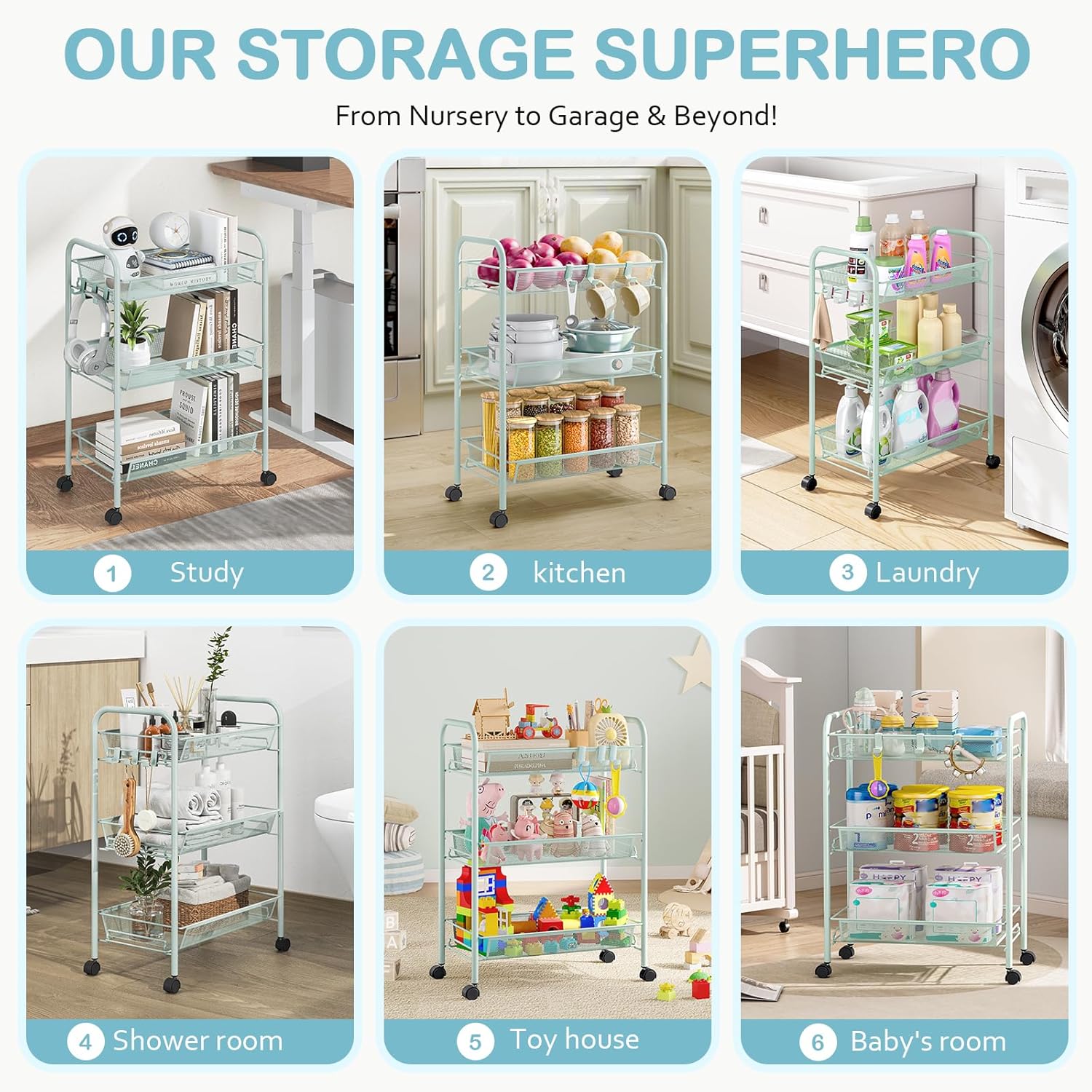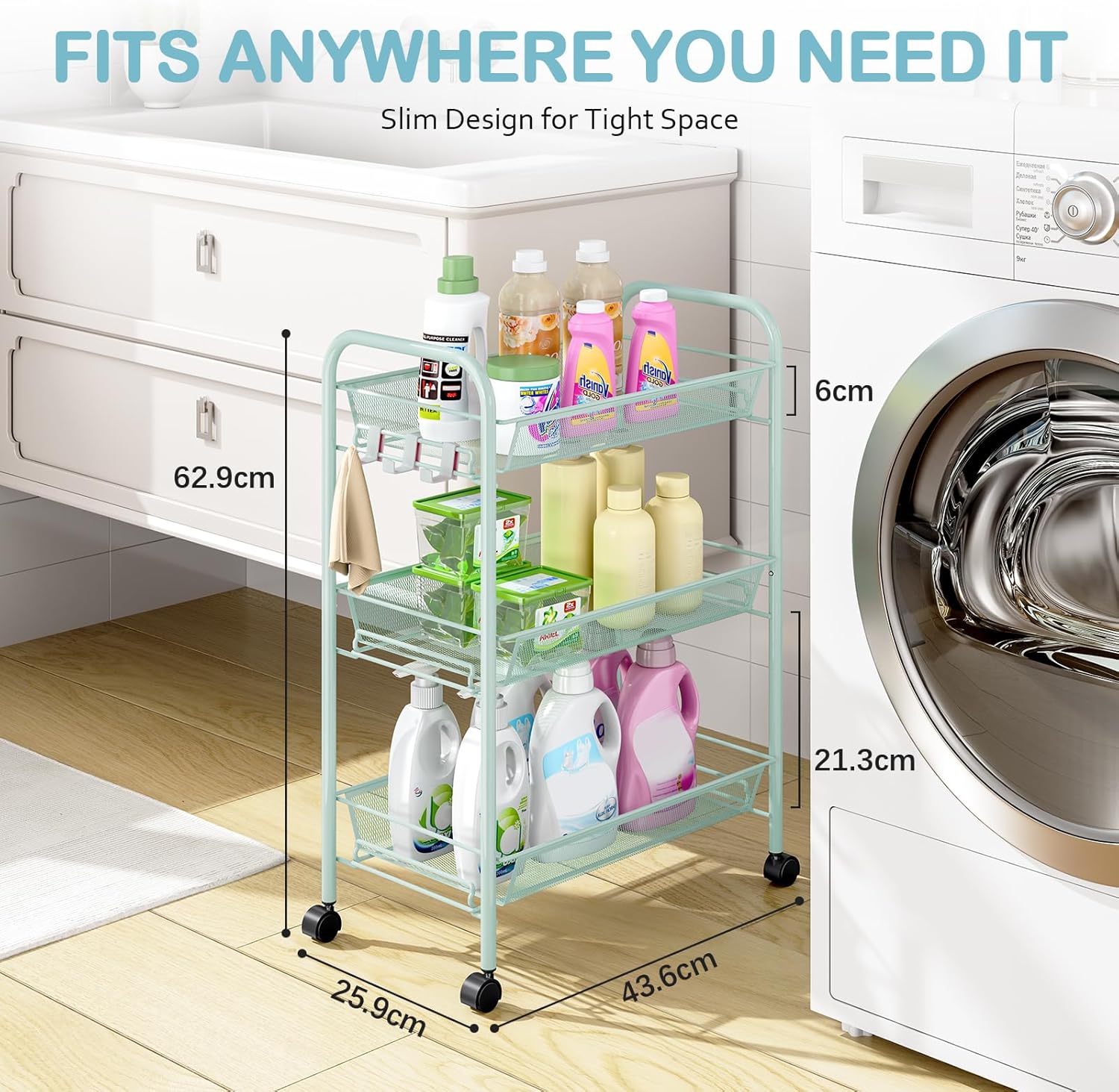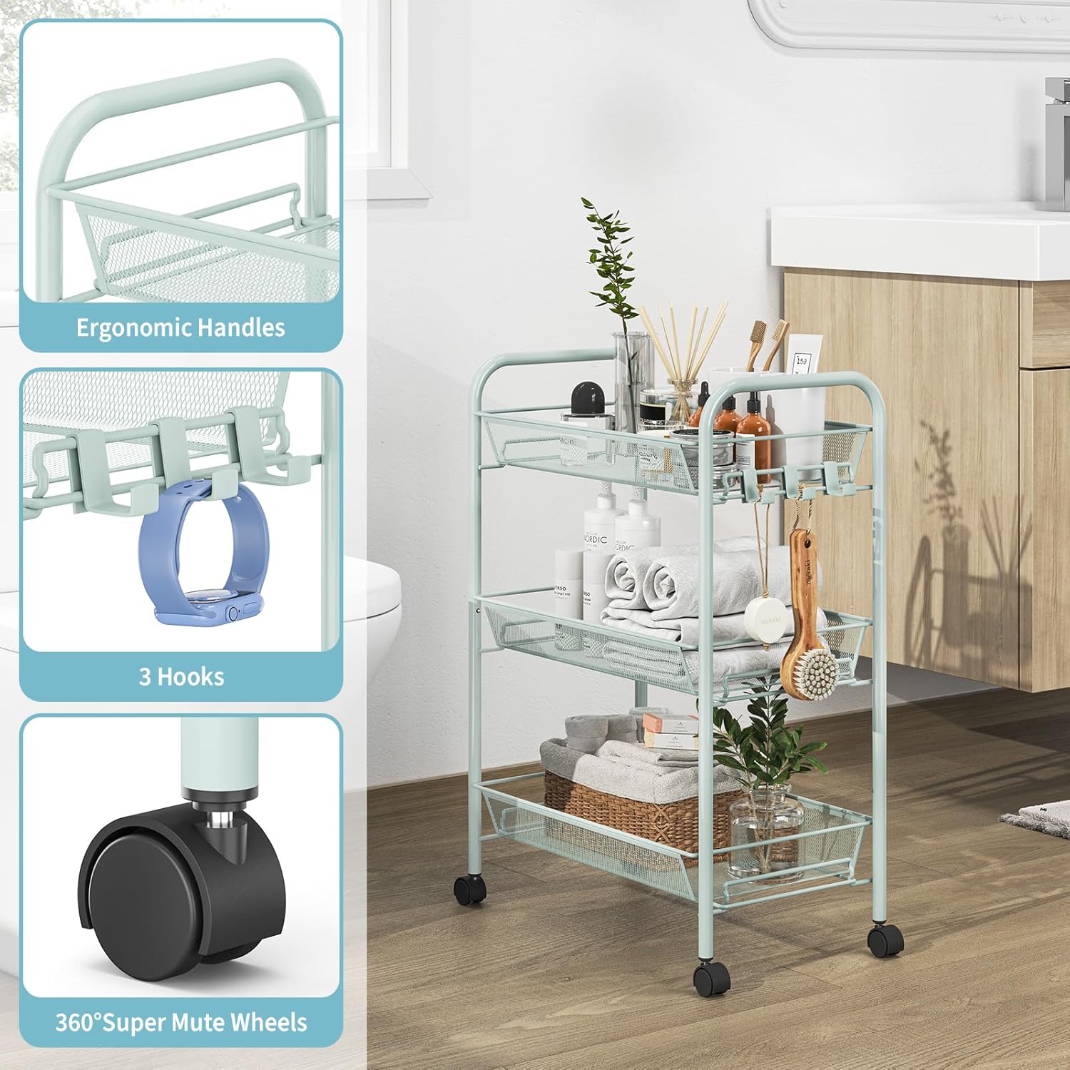 - 【Easily Assembled & Extra Storage】This utility cart needn't tools to installate, so you can easily and quickly to assemble the cart, just need snap the units together with a few minutes. 3 free side hooks for additional storage,like bath ball,wipes,scissors etc. It will more clear than put mess in a drawer.