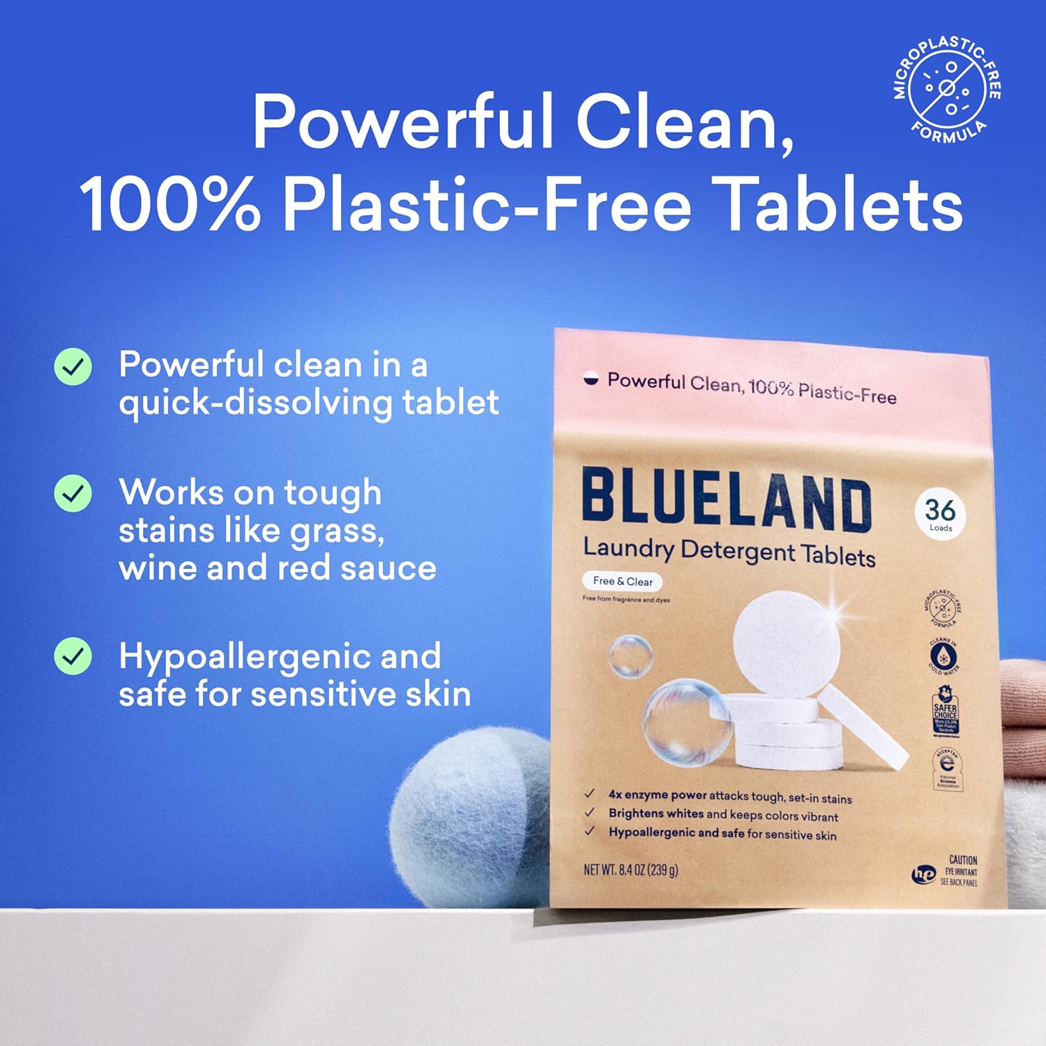 BLUELAND Laundry Detergent Tablets, 36 Count, Plastic-Free Eco-Friendly Pods, Sheets, Liquid Alternative - Fragrance Free and Clear, Natural, Gentle